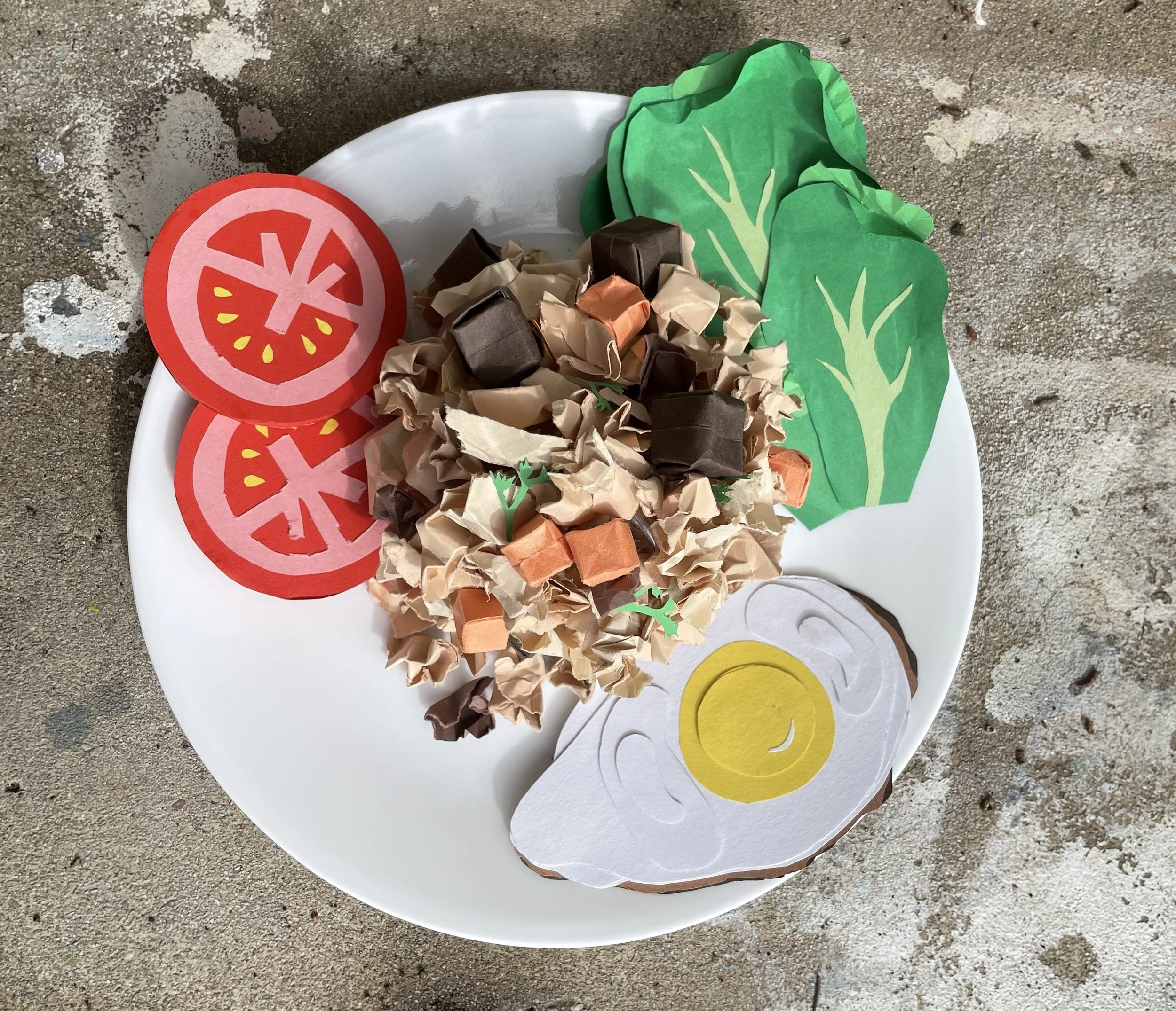What is magical about paper is that origami brings out the beauty of a commonplace object that I intended to show through my origami food art piece. Through Ollanski’s inspiration, my piece is to not be realistic but simple and have the remnants of toy foods. The combination of my memories of eating nasi goreng, that deeply connected me to my Indonesian culture, and my love for origami allowed the piece to become a strong representation of me and the significance food holds to me.