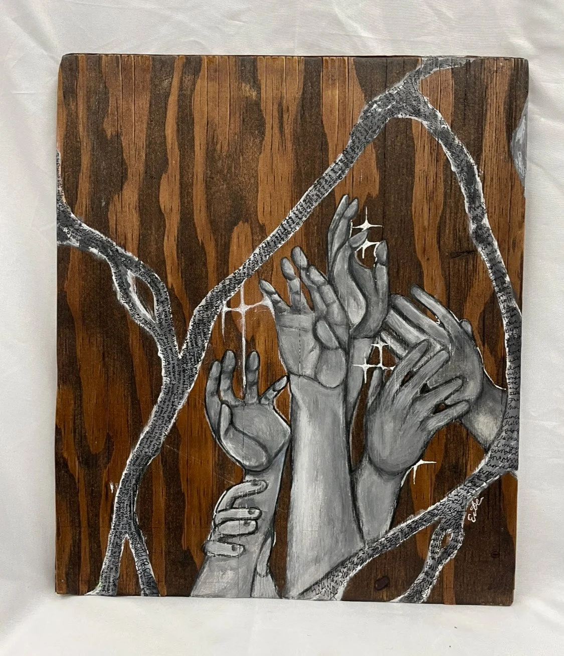 Every hand in this artwork is reaching out in different directions to convey different wants and needs for each individual, they all have different goals and aspirations for this lifetime they all want to pursue. There is wording on the cracks, being from the song Hands by Flatsound. That song encapsulates my artwork by talking about an artist's hands making and creating.