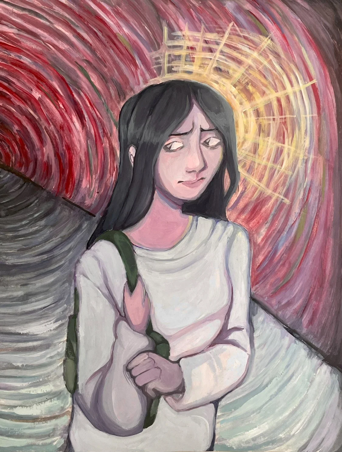 An anxious person walking alone at night in a vast empty street. In her mind someone or something may be following her. She holds onto her green bag to feel safe. She holds onto a feeling of safety in a situation in which she may be harmed, where she feels anxiousness and despair.