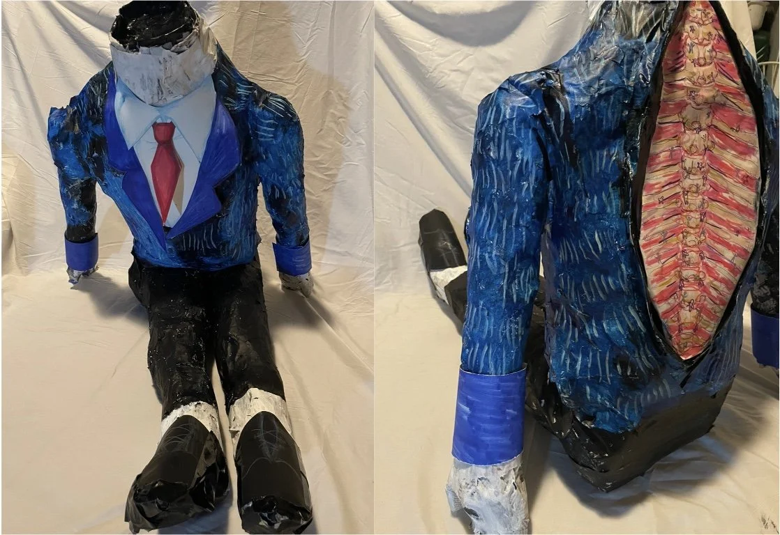 I wanted to display the majority and minority in corporations. There is the full body which is representative of the powerful bigger minority and when turning around the body you see one of the more important parts: the spine, the inner workings of the person as well as little people climbing up the body being the majority- climbing up the ranks and being the backbone of the operation.