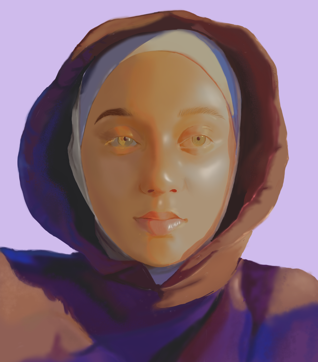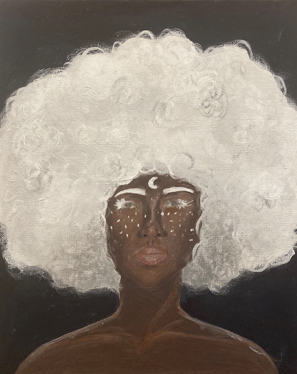 Following the theme of nature, man, and animal, this artwork explores the sub-theme of wonder. Moon spirits and moon deities exist in various mythologies and cultures. This painting’s aim is to explore this idea of the supernatural and humans’ obsession with depicting the unknown in forms resembling us, humans. To present this idea, I utilized contrast and texture to first bring focus to the hair, then the face, and then the overall picture, displaying a slightly supernatural person.