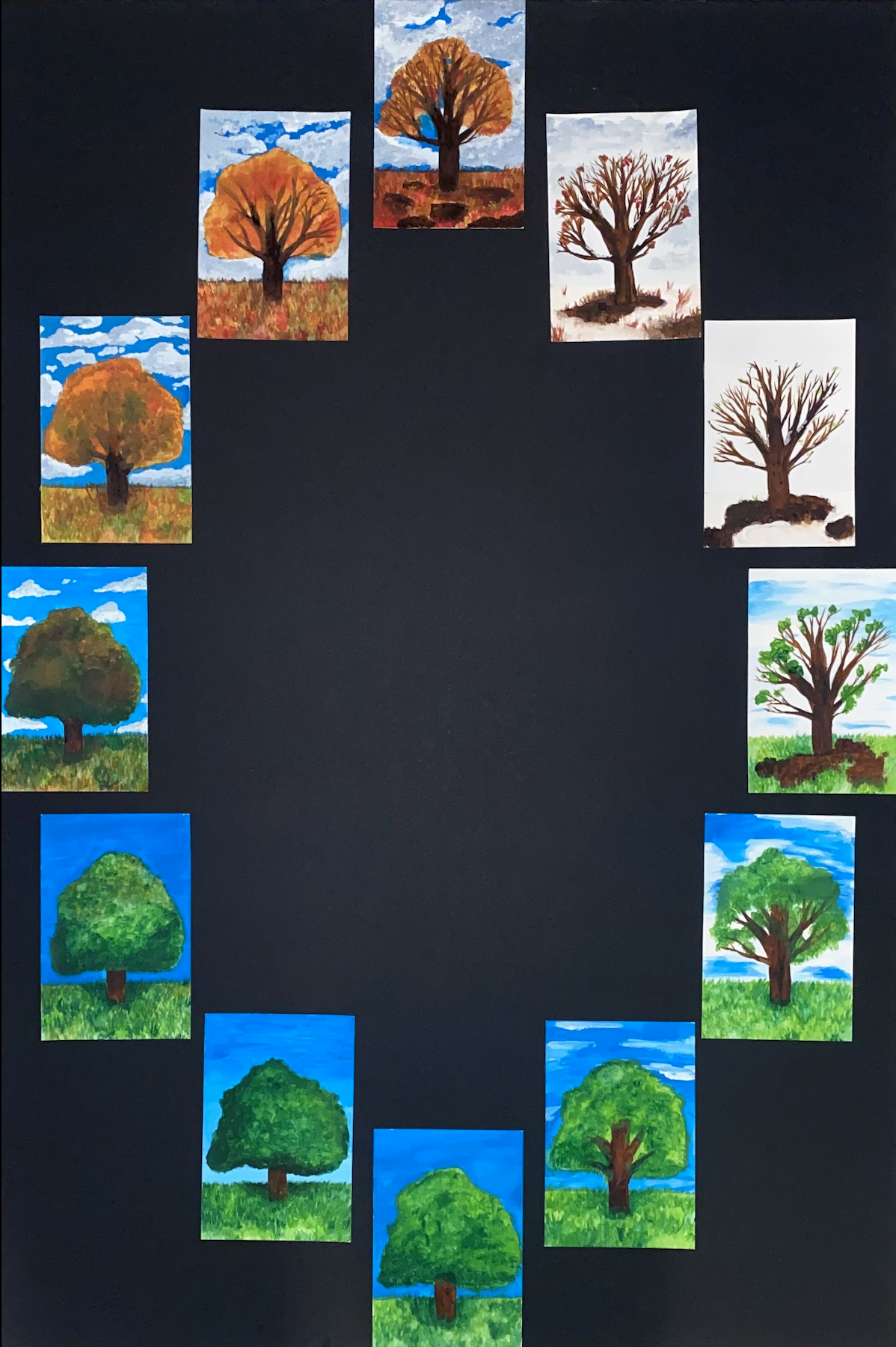 This work follows the theme of ‘nature, man, and animal’ with a focus on the display of the sub-theme of the passing of time in nature. One of the few constant things in life is the passing of time and the presence of change, and it seems that change can represent the passing of time in mesmerizing ways. Change in nature seems to follow a cycle. In this work, I hoped to communicate this presence of a pattern in the passing of time by observing a twelve-month cycle of a sugar maple tree.