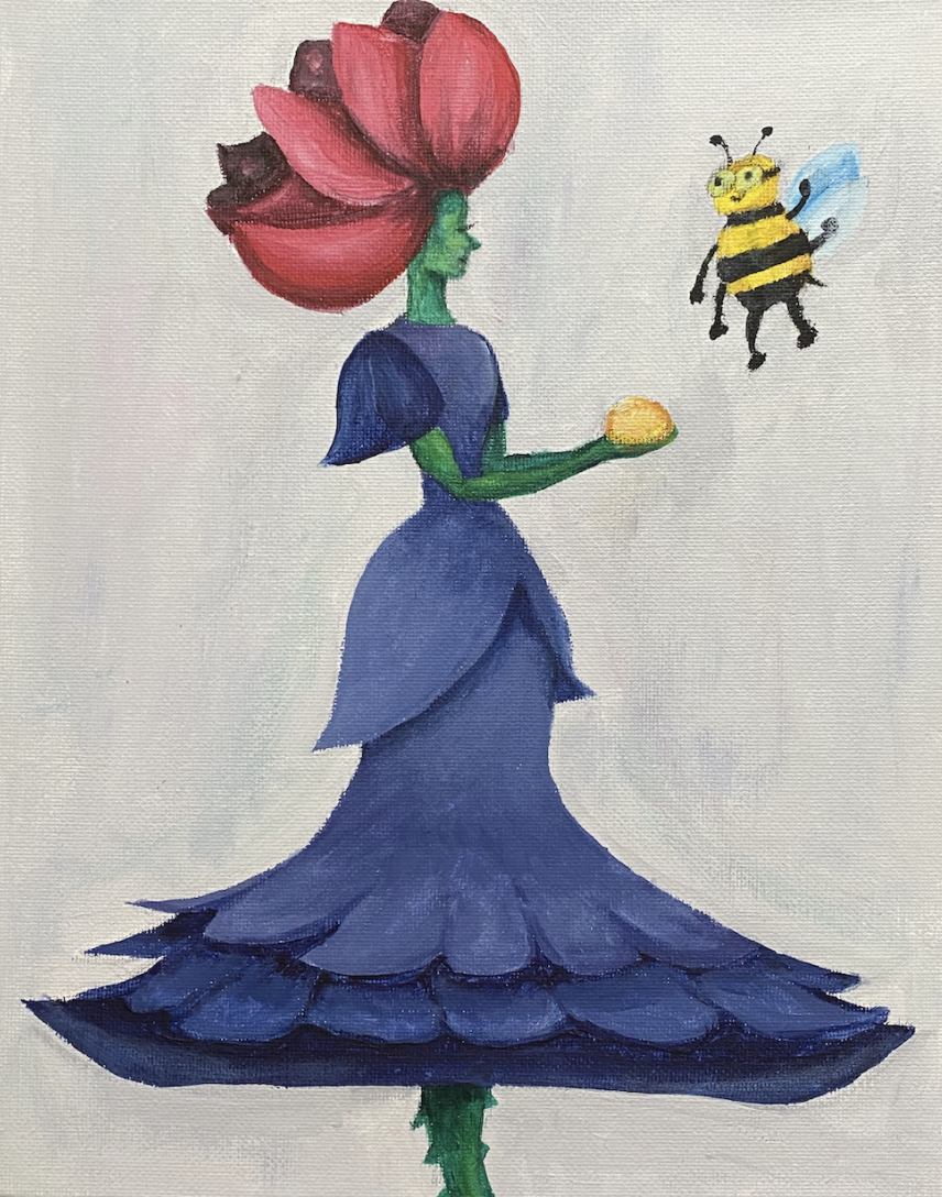 Within the theme of nature, man, and animal, this artwork explores the sub-theme of innocence. This artwork aims to describe a symbiotic relationship between the flower and bee. However this relationship differs from reality. Where the bee receives the nectar, the flower, in return, is presented with a dose of positivity of this friendly daily visit. I hoped to communicate innocence through the cartoonish, child-like style chosen along with an idea inspired by children's fiction.