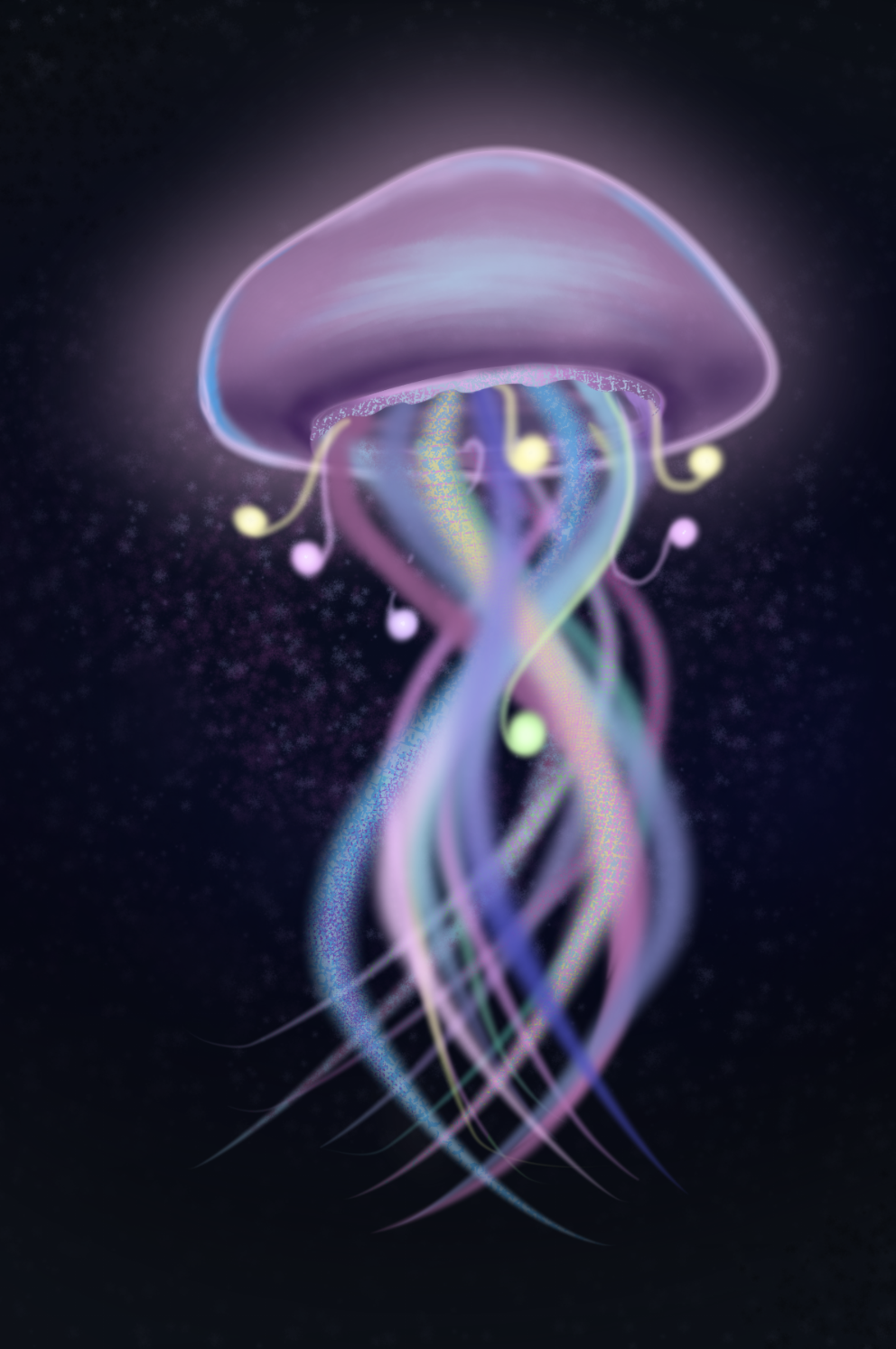 Following the theme of nature, man, and animal, this artwork explores the sub-theme of beauty. Through the use of pastel colors glowing against a dark background, my intent was to encourage the viewer to observe and realize the simplicity of beauty present around us by looking at a creature in nature whose existence holds plentiful beauty on its own, and yet it is a natural part of this planet. The work was titled "orbs" due to the orb-like tentacles present, which add a touch of imagination.