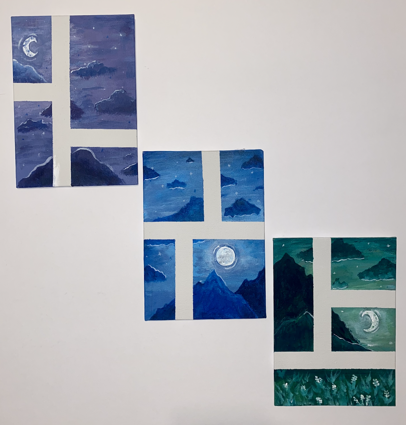 Within the theme of nature, man, and animal, this artwork explores the sub-theme of wonder. This piece aims to portray the wonder in finding serenity in the calmness of the night. Creating this scene of a night sky and landscape using a composition that breaks up the view into little sections helps it flow gradually and slowly, forcing the viewer to move from one section to another while fully observing the details. The full picture is noticed after examining the individual pieces.