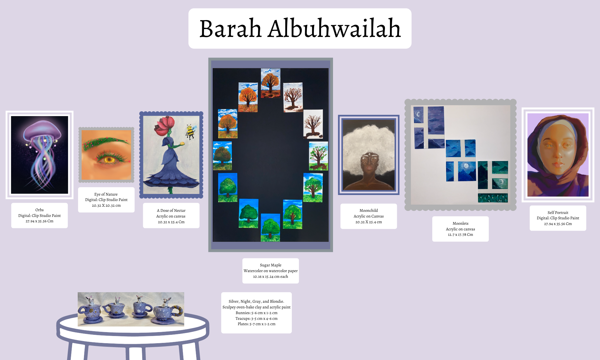 Through the sub-themes explored, I hope that I am able to encourage the viewer to reflect on the aspects of innocence, beauty, identity, wonder, and the passing of time within their own lives. My artworks communicate my ideas and observations, such as the passing of time within nature being a great example of change in a circular pattern. To represent this sub-theme, I created an artwork that explores the journey of a maple tree in 12 months. Similar to the process used to represent the sub-theme of the passing of time, I hope that this body of work will give insight into my general process of thinking and how I input and analyze the world. I was inspired to create this representation of this sub-theme through the simple observation of nature around me, which slowly led me to realize just how obvious, yet overlooked such observations may be. In relation to the passing of time, through using this impersonal example to the viewer, I hope to have created a reason for them to reflect on their circular journey within life, what have been their full circle moments. So, my goal within my body of work is to explore common ideas from a personal lens; however, leaving space for the viewer to apply the explored concepts to their own ideas.