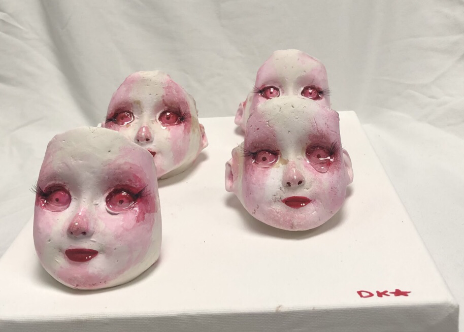 Air dry clay, acrylic paint, resin, faux eyelashes on canvas