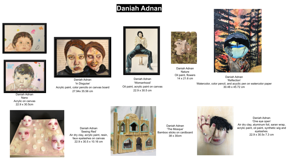 I organized my body of art by different relationships. On the right side, reflections of myself are present in three artworks: Nano, Seeing Red, and In Disguise. Seeing red and In Disguise. Nano is an acrylic painting, this is to illustrate childhood innocence as acrylic paint is often used by children to express themselves artistically. I employed light colors with shapes in the background, this is to depict childhood innocence. Seeing Red is a dry clay and acrylic paint piece which allowed me to emphasize my intent. I wanted to create a sculpture with multiple pieces to experiment with the medium more. In Disguise is an acrylic paint and color pencil painting which allowed me to try new color schemes such as cool and warm tones. I added fine details with colored pencils to allow more depth to my painting. In the center, the body of work depicts relationships with society: Womanhood, The Mosque, and One-eye Open. These artworks portray relationships with religion, other people, and societal gender discrimination. Womanhood is inspired by modern-day magazine covers and Slyvia Plath’s Mushroom poem which employed mushrooms as a metaphor for feminism. I used oil paint to represent the toxic nature of social norms, this also allowed me to spend more time working on the artwork and try to make it as realistic as I can. Focusing on making the figure stand out as she does not fit the feminine beauty standards. In The Mosque and Seeing Red, I made a structure made from bamboo sticks on cardboard and clay sculpture. This is to illustrate how religion and identity are fragile. Working with these mediums allowed me to be more involved in creating the artwork. On the left portray relationships with the natural environment: Nature and Reflection. Nature is made with oil paint and dried flowers. I wanted to depict how humans are toxic to the natural world. This is my first time working with natural flowers to create an artwork, allowing me to portray my intention. Reflection is made with watercolor, representing the natural world, this medium also allowed me to be more open-minded to mistakes.