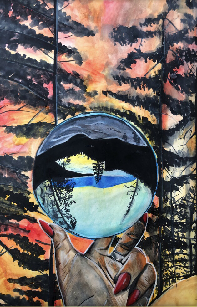 This artwork is inspired by a film titled “Extinction: The Facts” which focuses on the environmental issue of extinction which is changing the world that we live in today. I decided to paint on the subject of climate change. My intention is to depict the reflection of an ideal environment and juxtapose it with the reality which is represented by a forest fire. I decided to make a person holding the reflective sphere to encourage others to reflect upon their own personal choices.