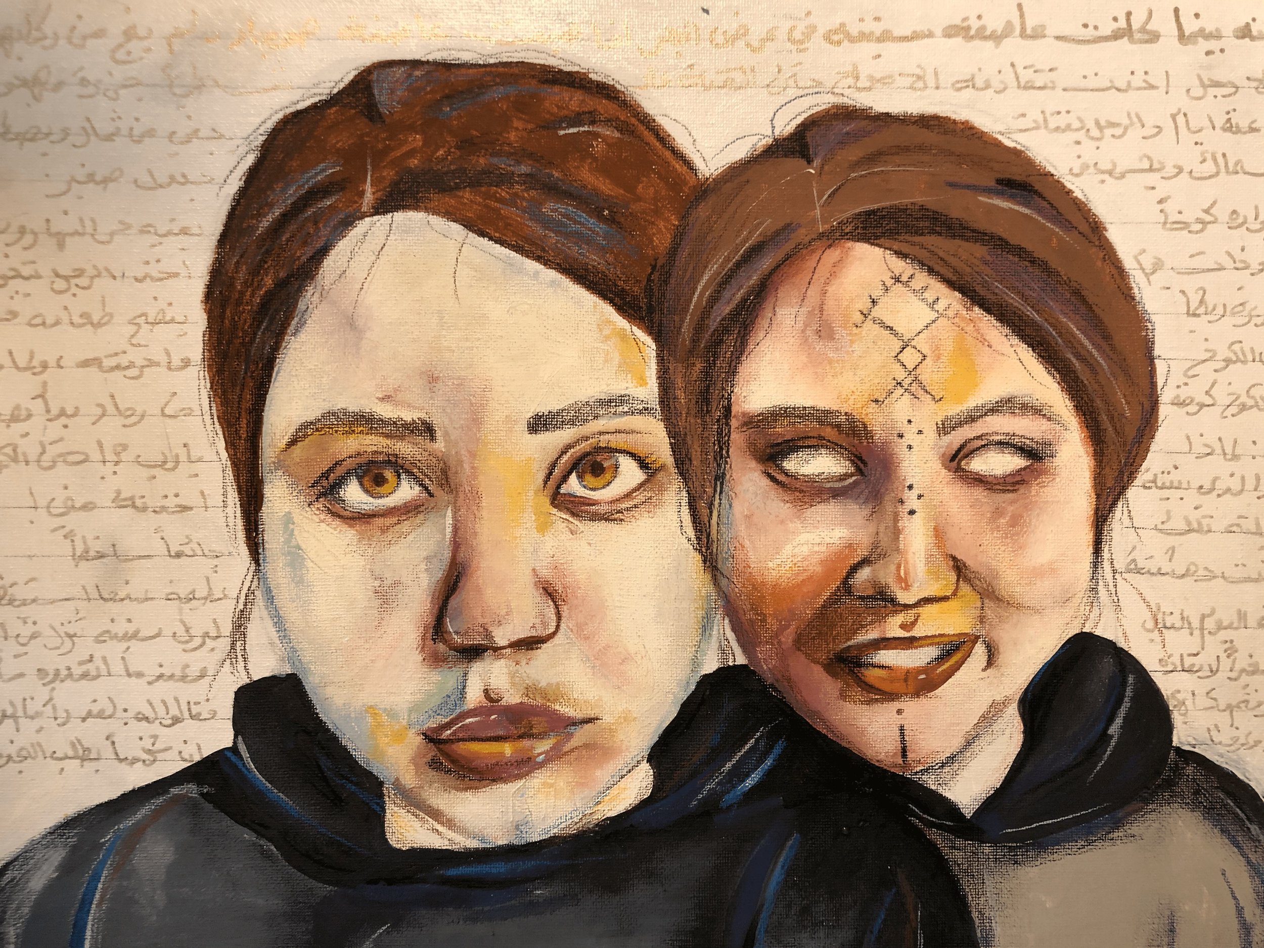 I was inspired to make my portraits more colorful. My intention is to depict the Middle Eastern shapeshifting monster named Sa'aali. I made it a self portrait with the contrast of the faces being the tones used, the one that is cool tones is the face that the shapeshifter uses, the colors depict it as dead and little emotion is being portrayed. In contrast, the warm tone has a sinister simile which depicts its natural form with traditional tribal face tattoos.