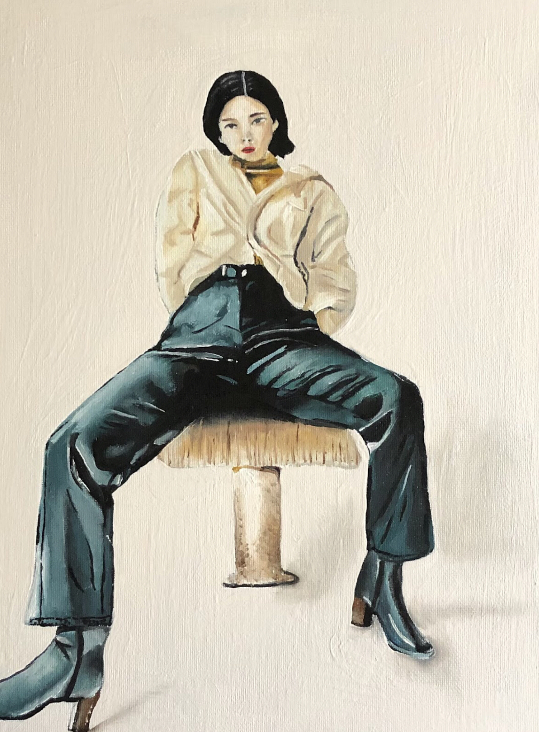 A poet, Slyvia Plath inspired this piece with her poem ‘mushrooms’ which juxtaposes the women's rights movement to how quickly mushrooms grow and spread. I decided to create an artwork that ties to this poem. I made an oil and acrylic painting. The subject is the woman, who is sitting in an ‘improper’ manner, wearing masculine clothing and hair. She is sitting on a mushroom, which alludes to the male sex genital, in which she has control of it and is sitting on it.