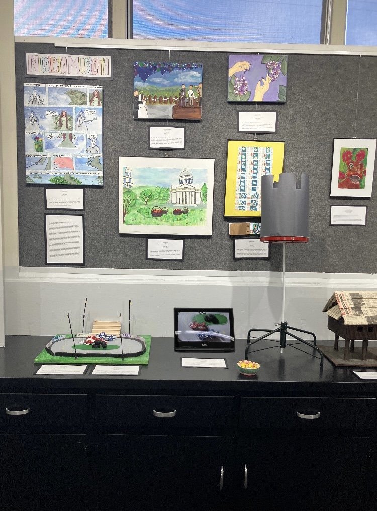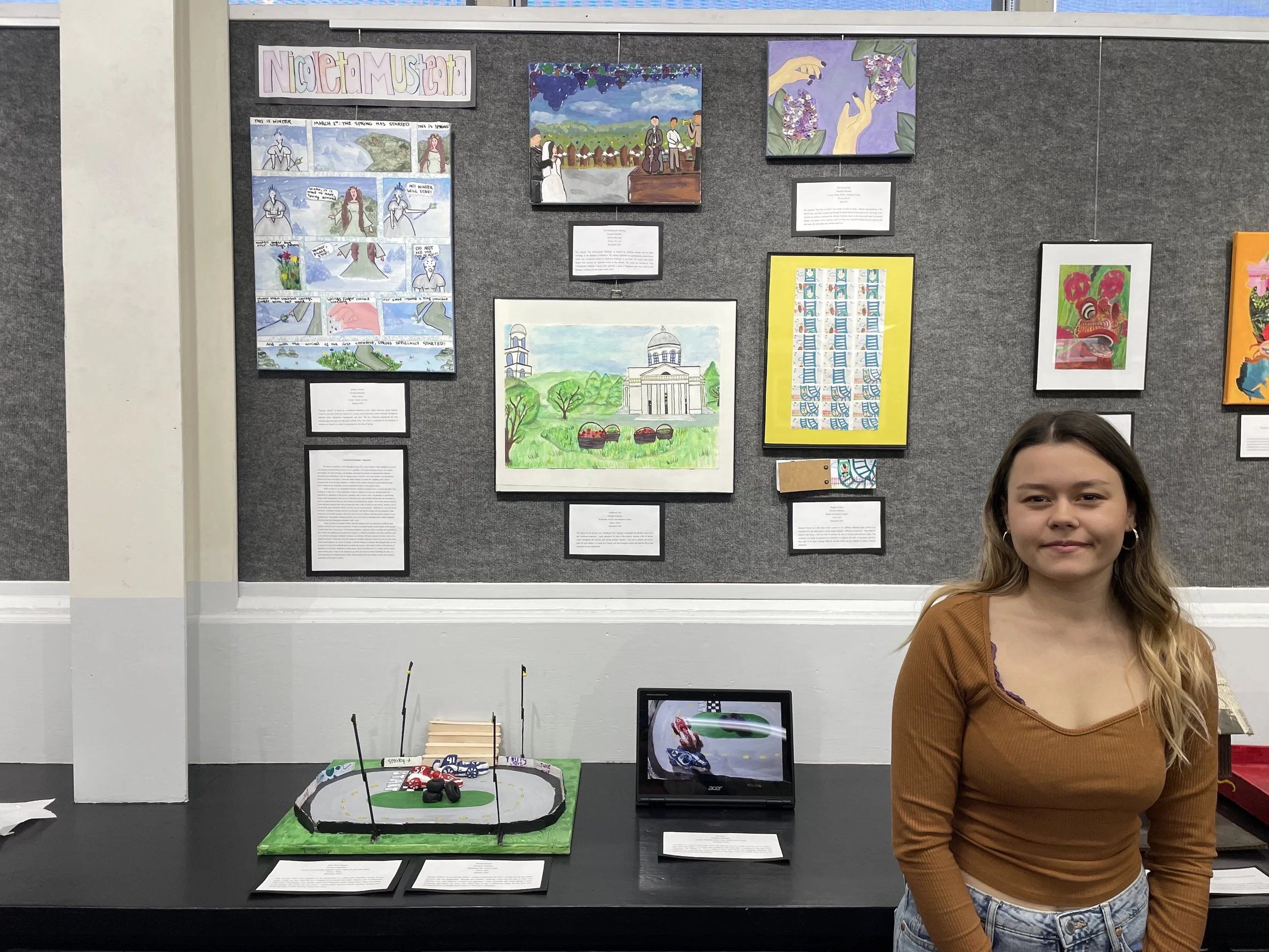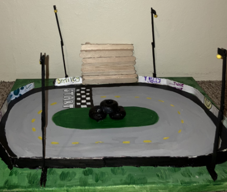 The artwork “Start Your Engines” is the second part of a three part animation project. It was made to pop out and catch the eye of people as an actual race track. Details such as bleachers, lamp posts, and barriers were mainly made out of popsicle sticks which were a large contributor to this project. The arena was very much a mixed media, between pencil, markers, acrylic paint and air dry clay, it made the piece seem more alive.
