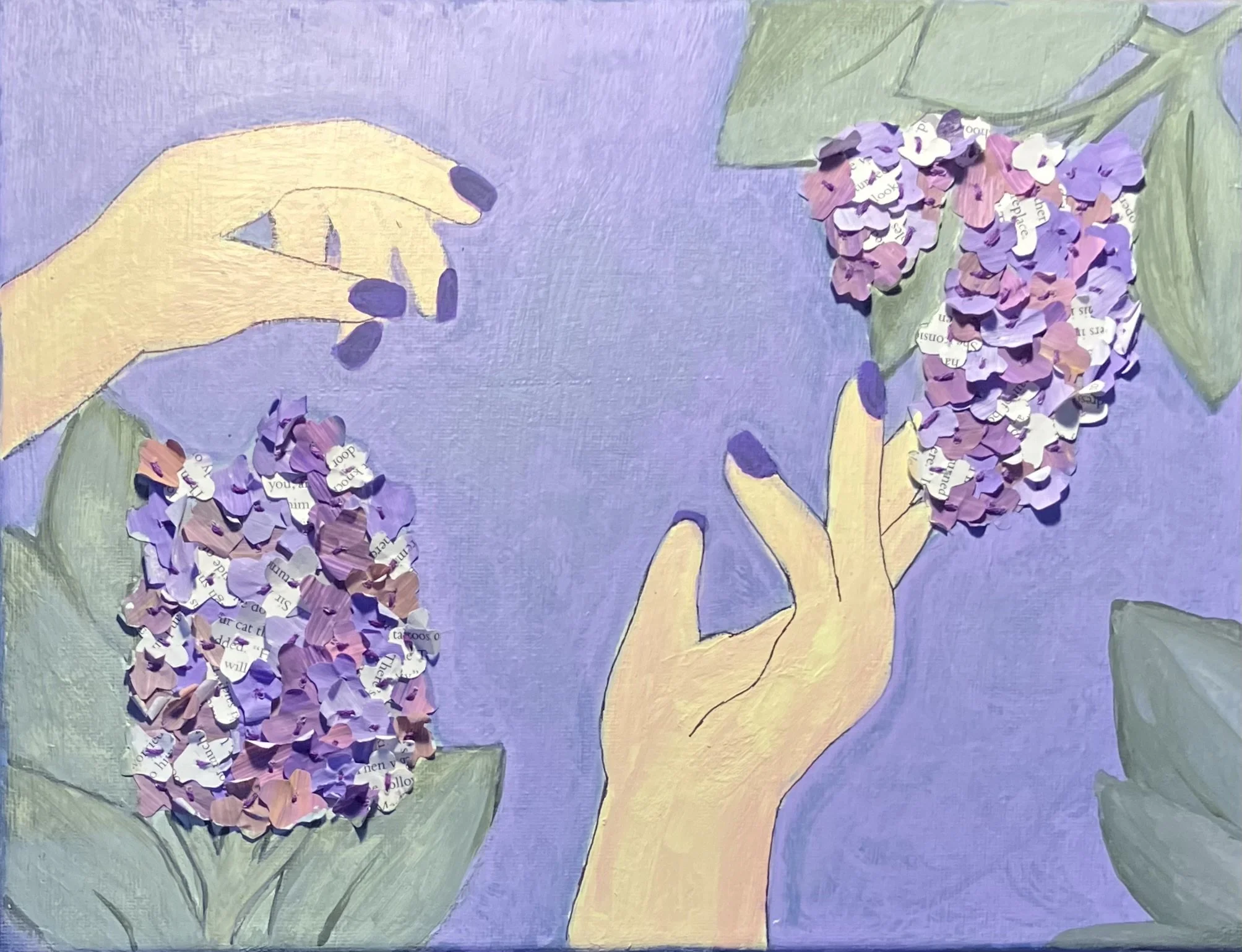 My artwork “The Feel of Lilac” was made in order to create a distinct understanding of the flower lilac, and how it stands out through the small flowers which make it full. The hands in the artwork are meant to represent the feeling of getting closer to the flower and being in its natural habitat. The pastel colors used are meant to bring out a peaceful feeling about the painting and also make the individual lilac flowers stand out. -