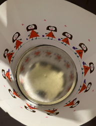 Rolling Around is a zoetrope which is an animation of a little girl catching a ball and then throwing it away, with a butterfly flying around. It is supposed to be a coherent animation which by spinning fast you can see the well flowing movement. The outer black paper is to help break the different motions and make the eyes focus on a certain point. The animation is also built to spin around with the help of a tin lid attached to a metal stick, and being held together by two cardboard sticks. -