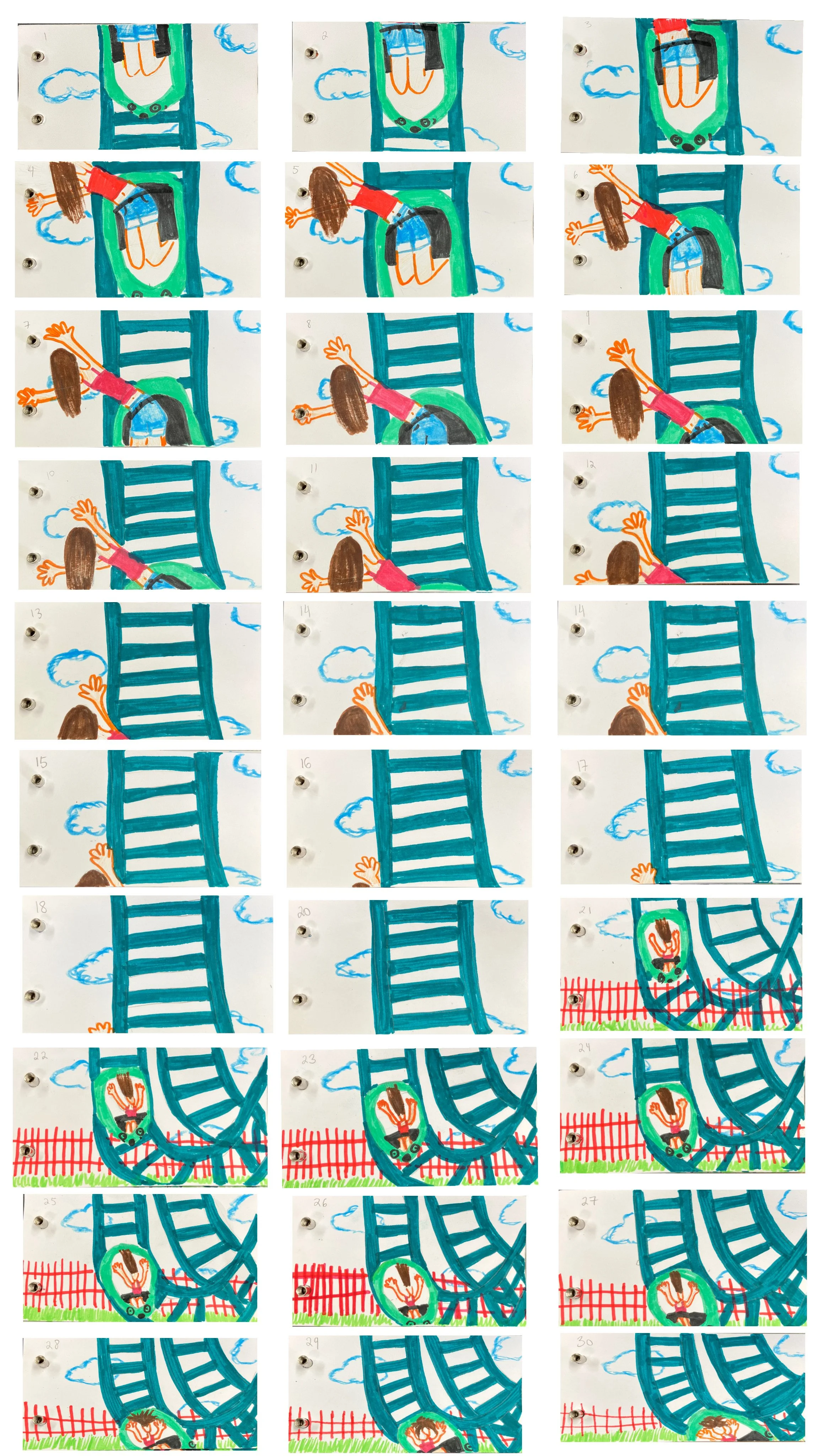 Stomach Twister is a flip book which consists of 30 different flashcard pages which is an animation of a girl going down a roller coaster through 2 different perspectives. With different markers and colors I tried my best to recreate the idea of summer and adventure parks. The animation was made on purpose to be unrealistic to represent old styles of animation, and how they used to be done, through different motions which are put together to make a smooth animation. -