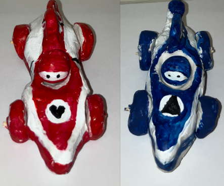 “Racing Motion” is an artwork where I wanted to represent the idea of racing cars in our culture and how they are represented. Through this artwork I used the colors red and blue to show two different cars, with different symbols and represent a more feminine side (red) against a more masculine side (blue). By using clay which does not dry it helped me shape the two race cars, and helped me in modeling them nicely in “The Race” animation. -