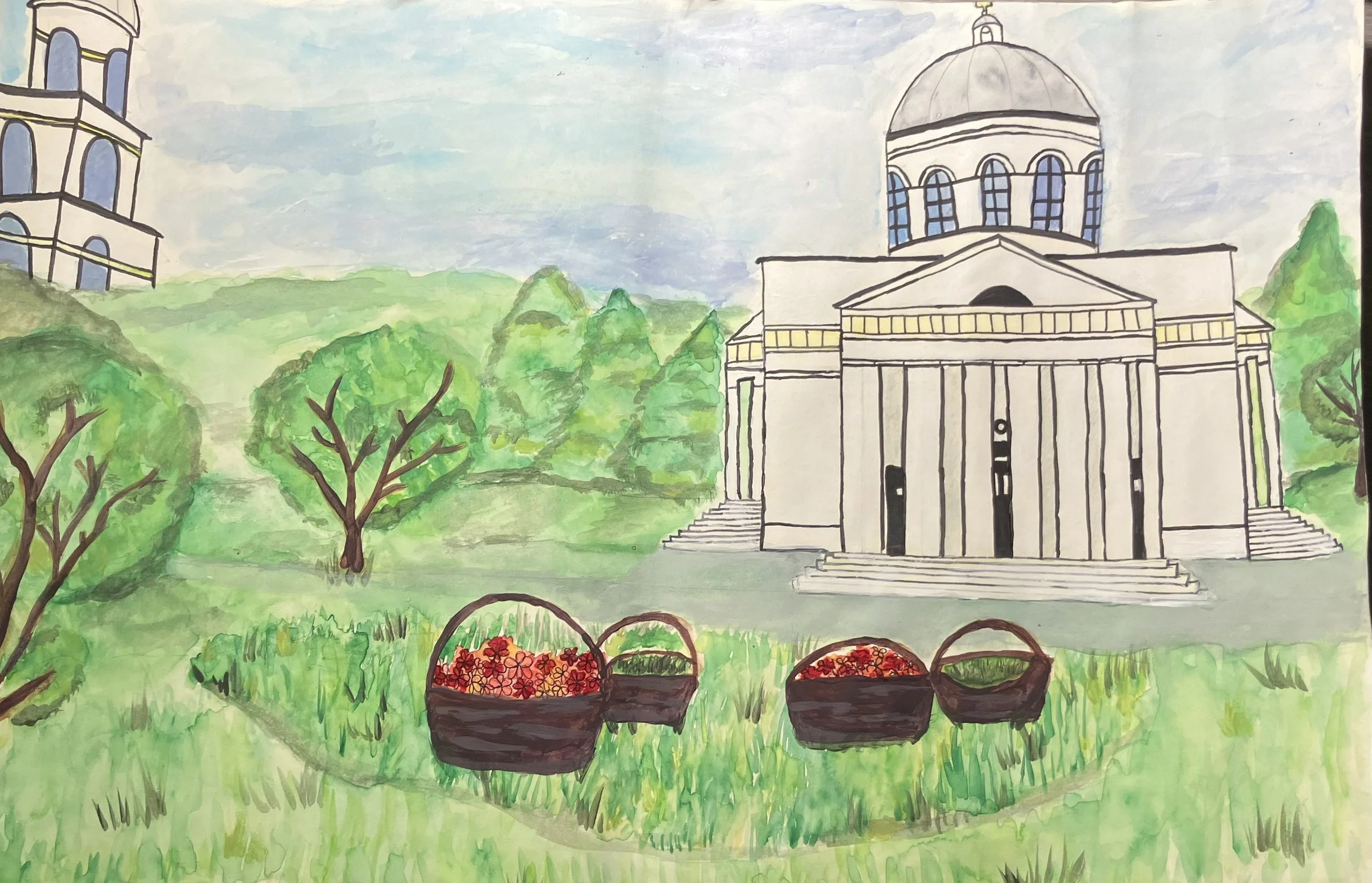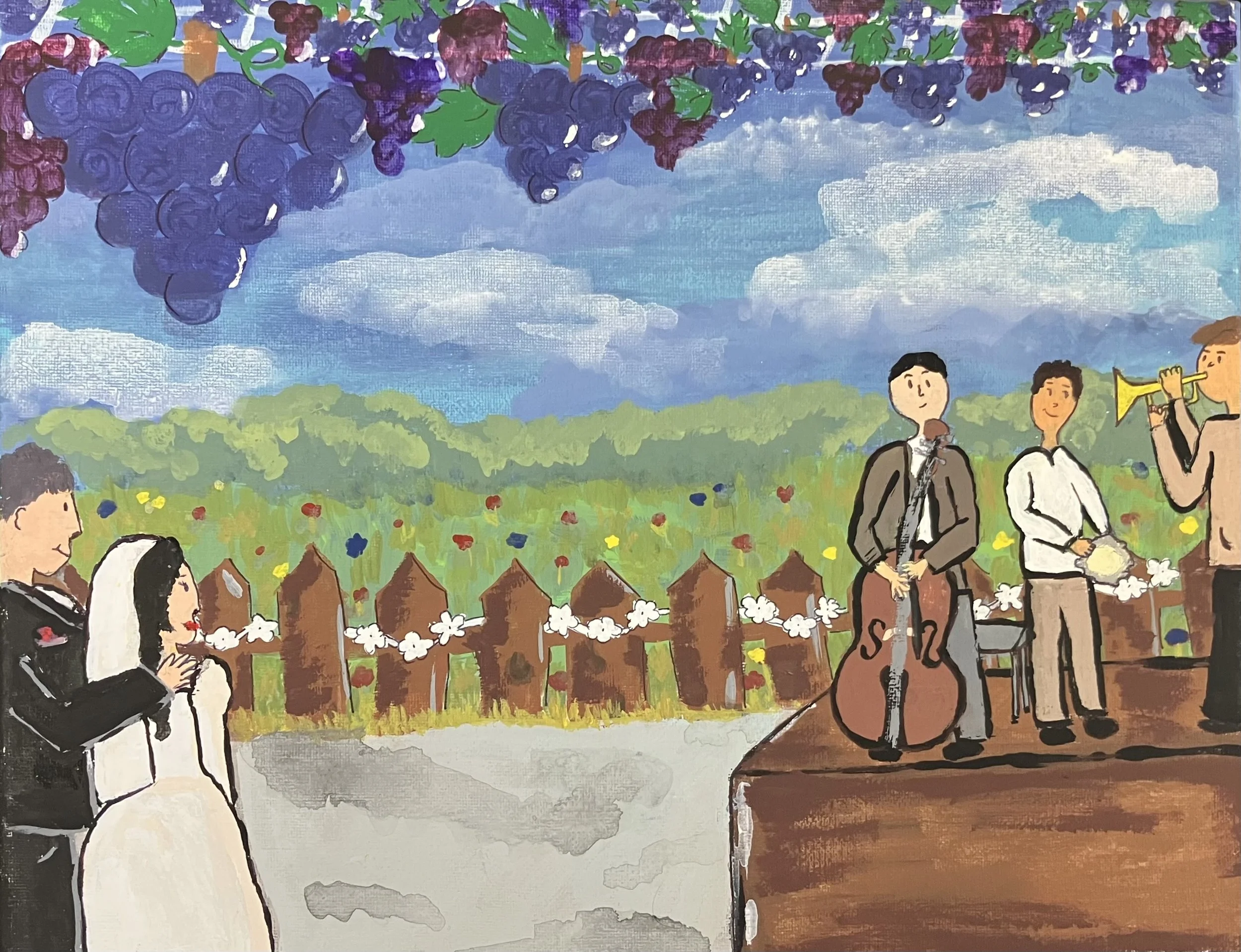 The artwork “The Unforgettable Wedding” is inspired by wedding settings, and by olden weddings in the Republic of Moldova. The setting represents my grandparents current house which was a traditional setting for Moldovan weddings. It was done with acrylic paint which helped with layering the important colors to the artwork. The colors are essential to “The Unforgettable Wedding” because they represent a sense of happiness and unity which is felt through a wedding with the bright, warm colors. -