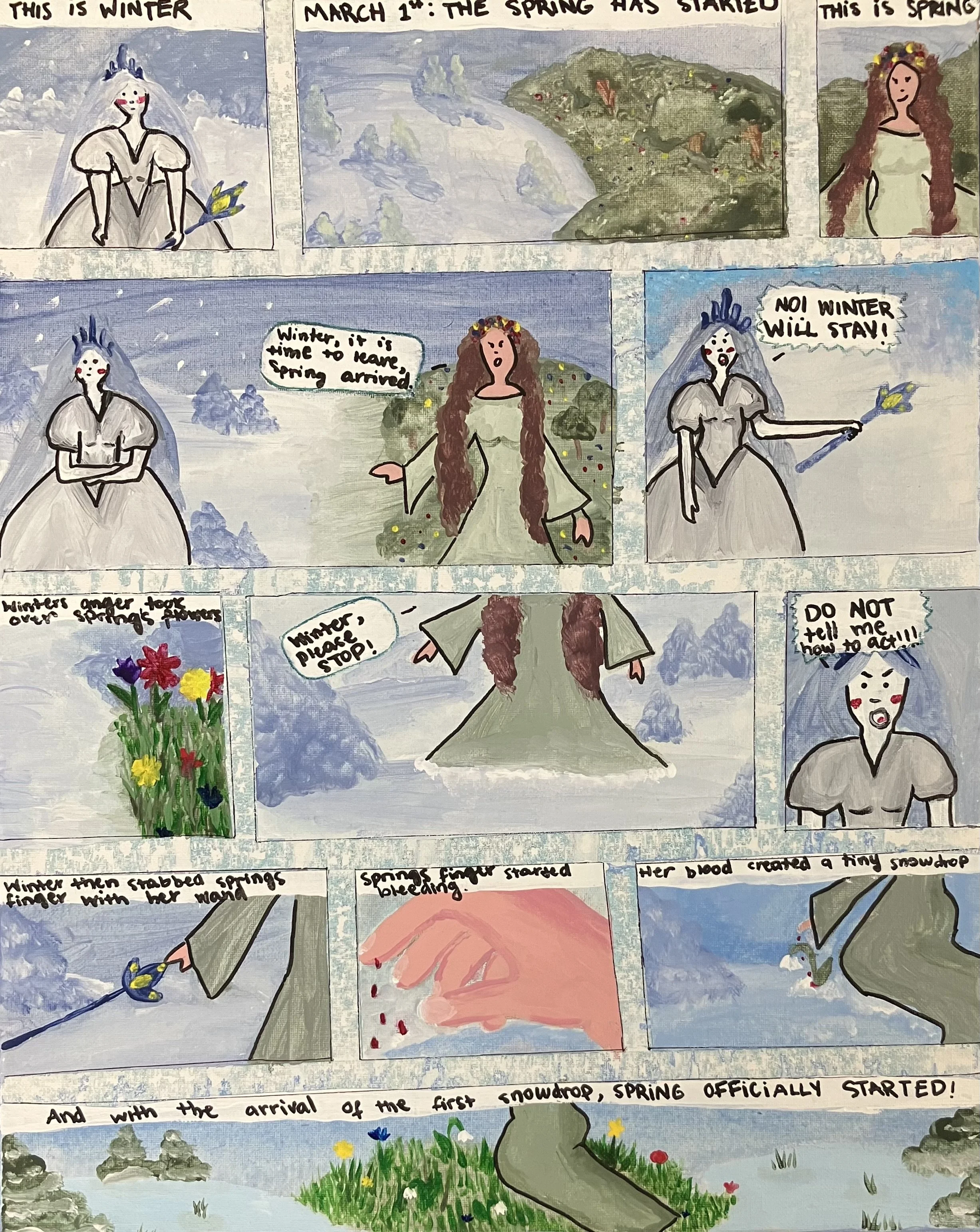 “Spring’s Arrival” is based on a traditional Moldovan story, which discusses spring fighting winter for the start of the new season. It is a comic strip which tells a story constantly through the different facial expressions, background, and style. The two characters distinguish the idea between bad and good and that good always wins. This story is celebrated in the Republic of Moldova on March 1st, which is considered the first day of Spring. -