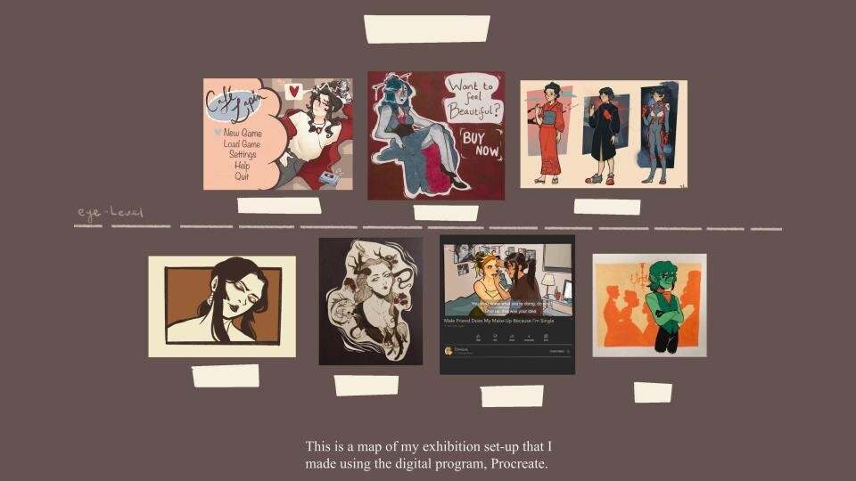I chose a very classic arrangement, two rows, three pieces on top, four on the bottom. The top row would consist of the three pieces with pink undertones, while the one below displays the ones with orange undertones, with pieces with similar colors grouped together, as a means of cohesion. The three pieces with darker palettes would be placed in the center, so as to draw the audience's attention inward. This not only draws attention to the collection, but it also helps to direct the eye. Two of my pieces have tan backgrounds that are very similar in shade, so I elected to put them opposite (diagonally) in order to balance them. I am aware that my style and collection at first glance does not read as something very deep, so in order to gain attention, I need to first peak their curiosity. Once they look further though, I hope to inspire new perspectives on: what counts as escapism, what are the benefits and disadvantages of it as a tool, etc.