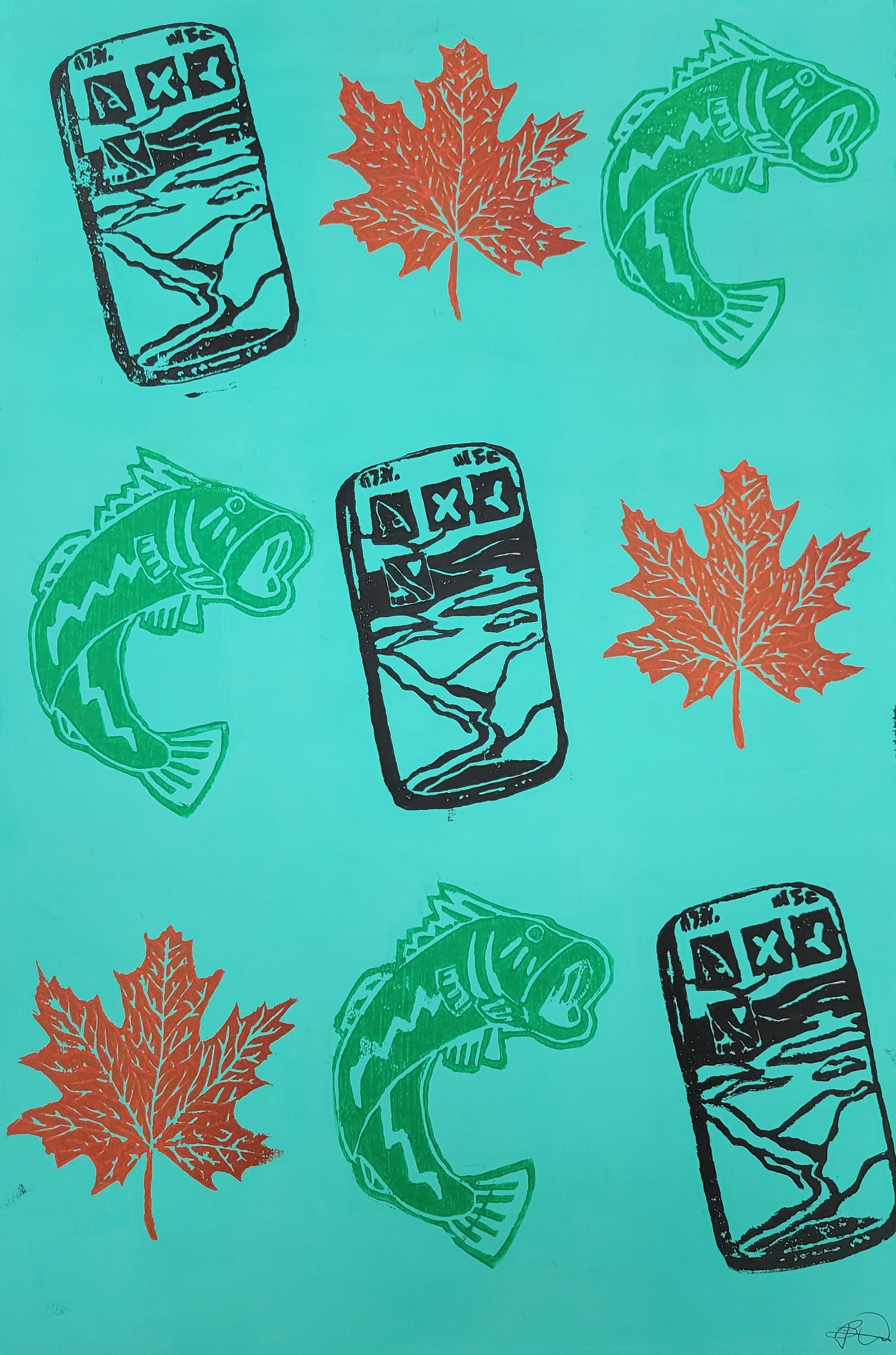 My goal for this project was to show the connection between consumerism and nature through Andy Warhol-inspired pop art. To accomplish this I used linoleum prints on a piece of paper with acrylic paint and created a diagonal pattern with the prints. The phone is meant to demonstrate how technology can connect us further with nature, and bring us closer to it, despite being the direct opposite.