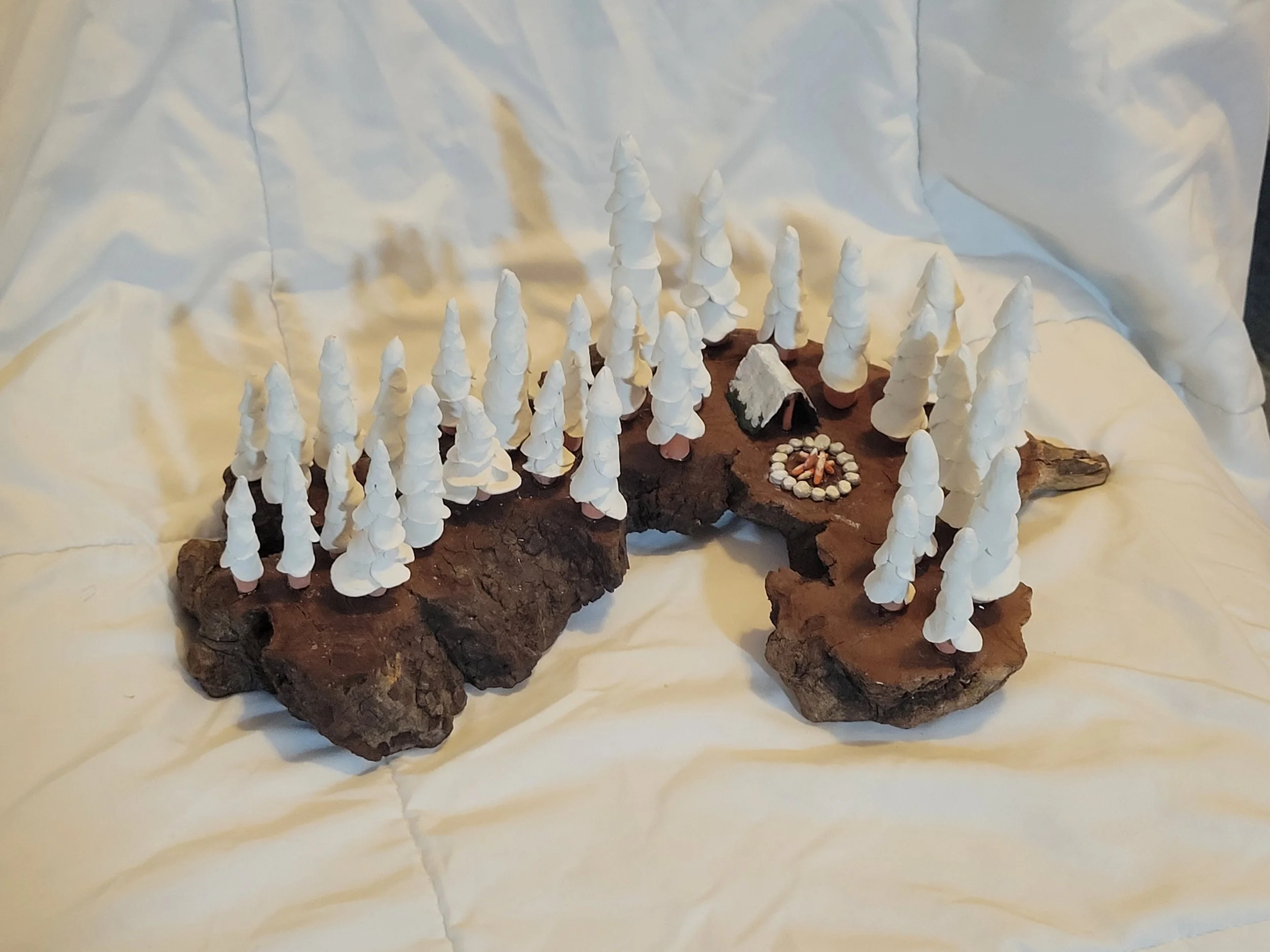 For this project, I gained inspiration from Christopher Reid’s Redwood Campsite, which gave me the idea of creating my own. However, I decided to create a miniature of a snowy campsite and decided to use air-dry clay and attach it to a piece of wood to give it an interesting base. I imagined that the campsite was on the side of a lake, on a sandbar, and built the forest around that idea. The campsite itself is just a simple tent and fire, and no one is there.