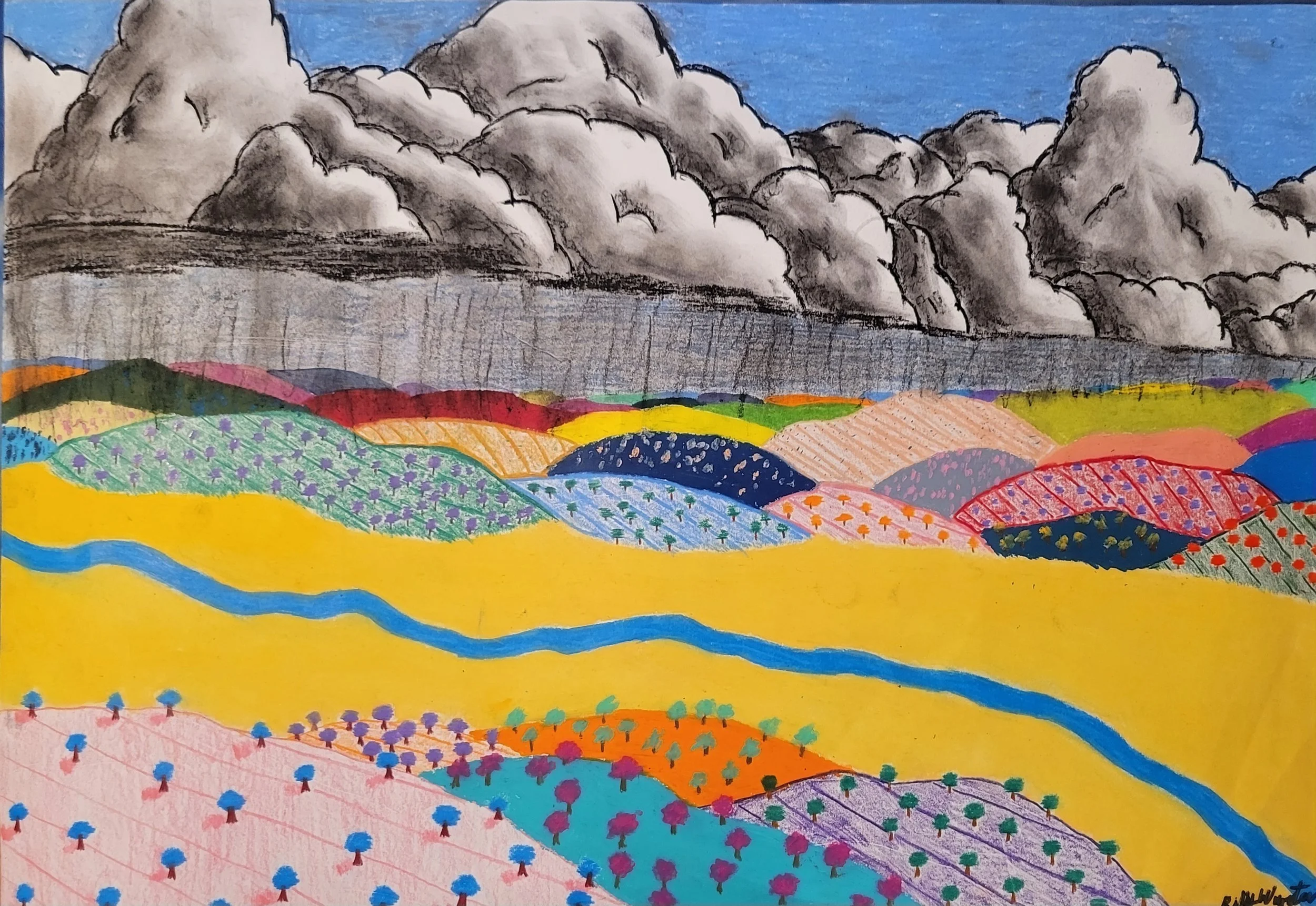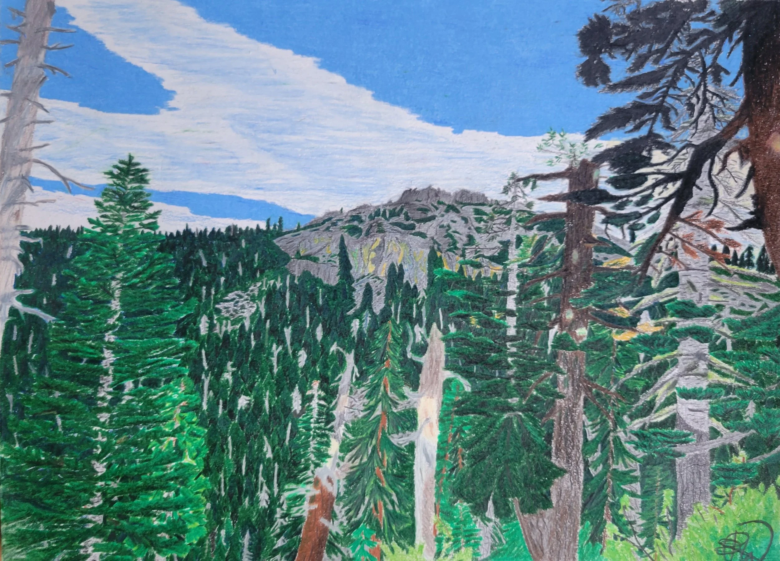 This piece is based on a picture I took of a place my family calls “The Rock Pile Canyon.” I spend a lot of time in nature, and this is one of my favorite places, as I annually sit in that spot on the opening mornings of hunting seasons. As my theme is nature, I figured it would be a great picture to adapt to colored pencils. Overall I just wanted to recreate the scene and push people to get out into nature.