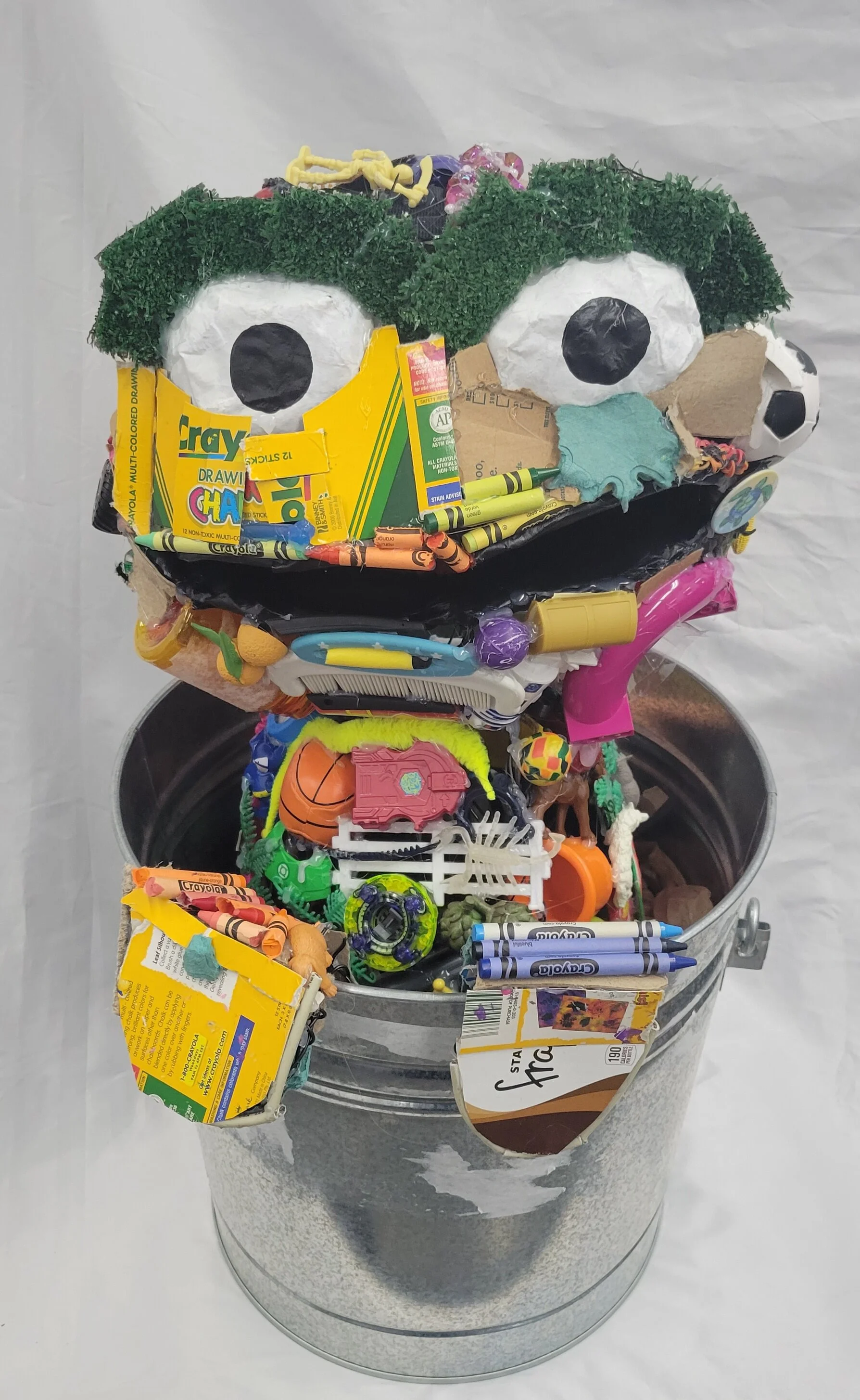 This piece was inspired by Constance Mallinson’s Cliffhanger and Sesame Street’s Oscar the Grouch. Cliffhanger uses a combination of muted and colorful pieces of trash to create a large mound, and I wanted to use that in my piece. I took the character of Oscar the Grouch who is always in the trash and turned him into the trash, using a combination of bright and bleak toys and pieces of trash to create his body.