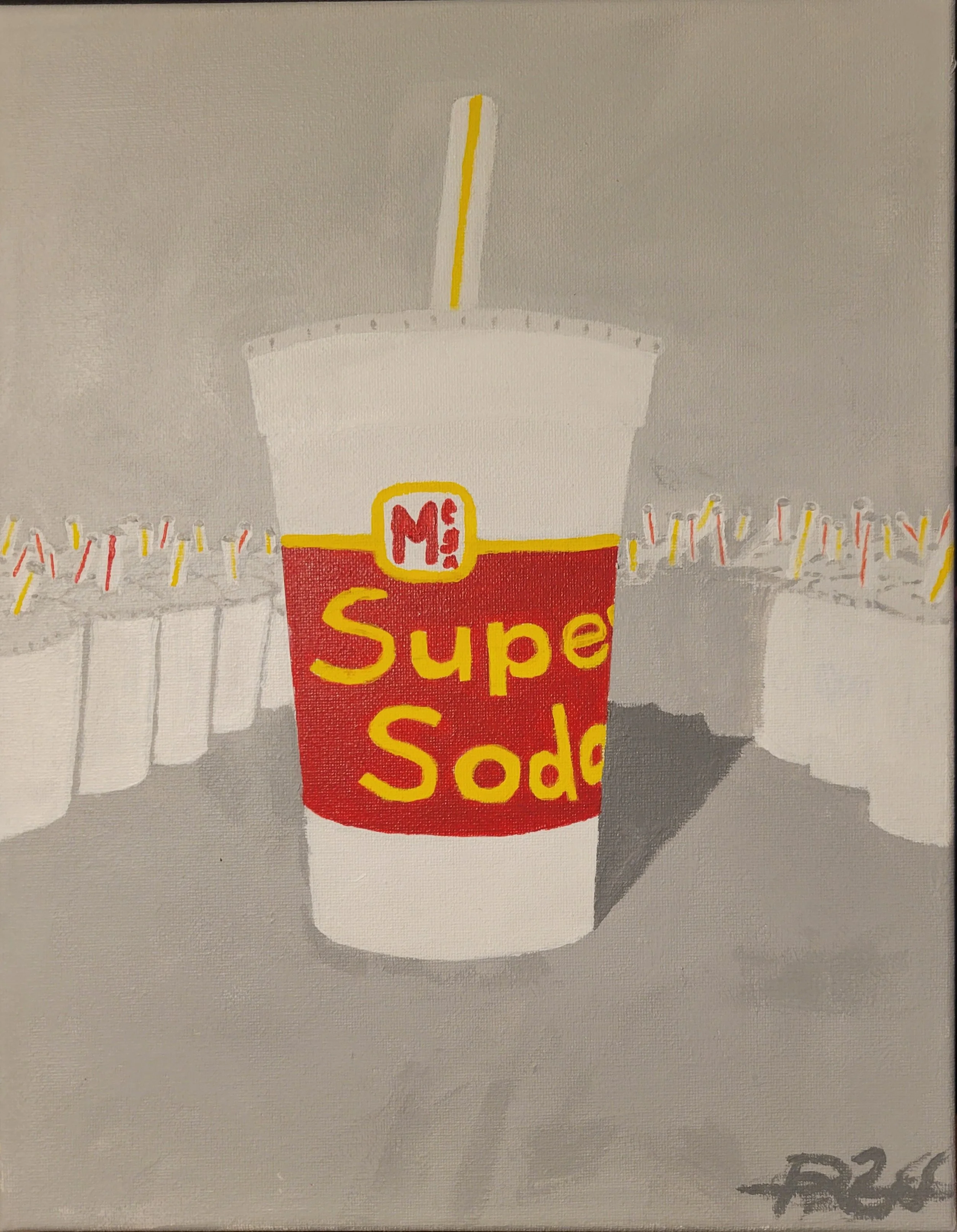 Super Soda is heavily inspired by Wayne Thiebaud’s “Eight Lipsticks.” He emphasizes the subjects of his piece through the use of bright colors on them, and muted colors in the background. I took that into this piece with the gray and white leading the eye to the central soda, which has a burst of red and yellow, to draw the eye in further. The red and yellow are a call to colors heavily used in marketing, and the amount of sodas alludes to how similar and common marketing is.