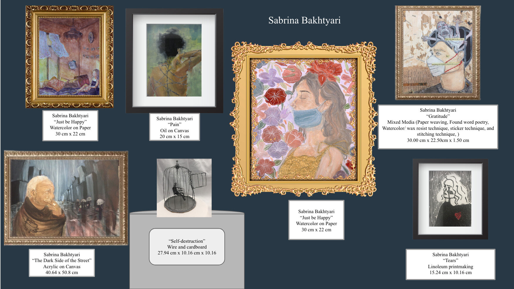 In order to reach this goal, I focused on certain struggles that I saw around me such as poverty, depression, the pandemic, loneliness, and much more. For my paintings, I mostly used acrylic paint. However, I tried to reach out of my comfort zone by experimenting with different mediums such as oil and sculpture making. All these experiments led me to my further passion in the theme of human struggles and emotions. Throughout the process of creating my different paintings, I focused on artistic techniques that would help me such as one point perspectives and the symbolic meaning of colors. I really tried to use colors purposely and use different techniques according to the topic that I explored in my artworks. For example in my piece, “Gratitude”, I used mixed media, the use of different art mediums, to represent the chaos that was created at the time due to the pandemic by adding a literal chaos using ripped papers and dull colors. Throughout all my pieces, it can be seen that people are the main focus of my paintings. This has led me to the understanding of how we as humans communicate our emotions. Although our actions and language can help us communicate, our expressions and face play an important role in helping us communicate our feelings the most. The next important aspect of my artworks were the names. I chose to create titles for my pieces that would help the audience understand the general meaning of the artwork while giving them enough space to explore and understand more through examining the pieces. For example, in my artwork “Just Be Happy”, the title can help the audience understand the general meaning of the artwork which is depression. However, after examining the artwork, they can see the papers on the bed with the writings in them saying, “be happy”. This connection between the titles and pieces can be seen throughout my artworks.