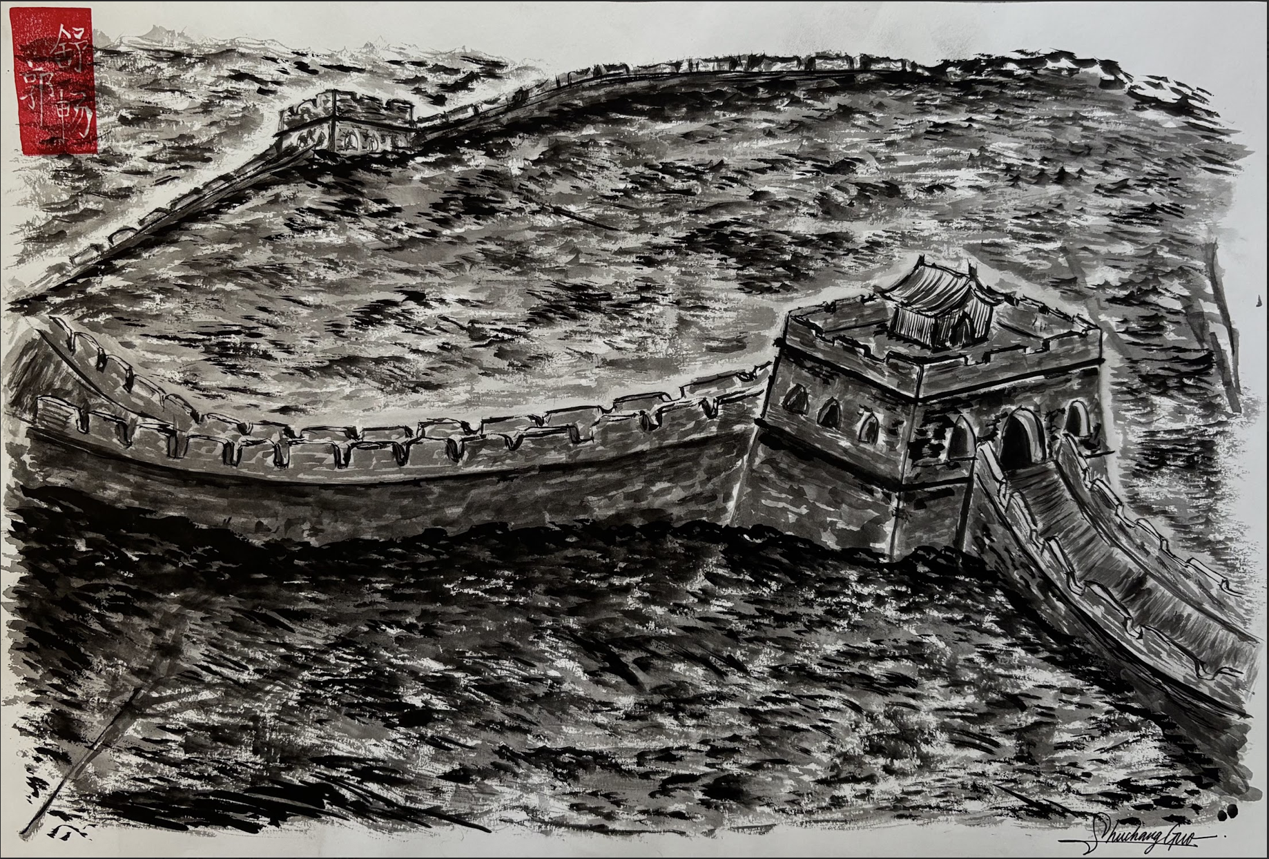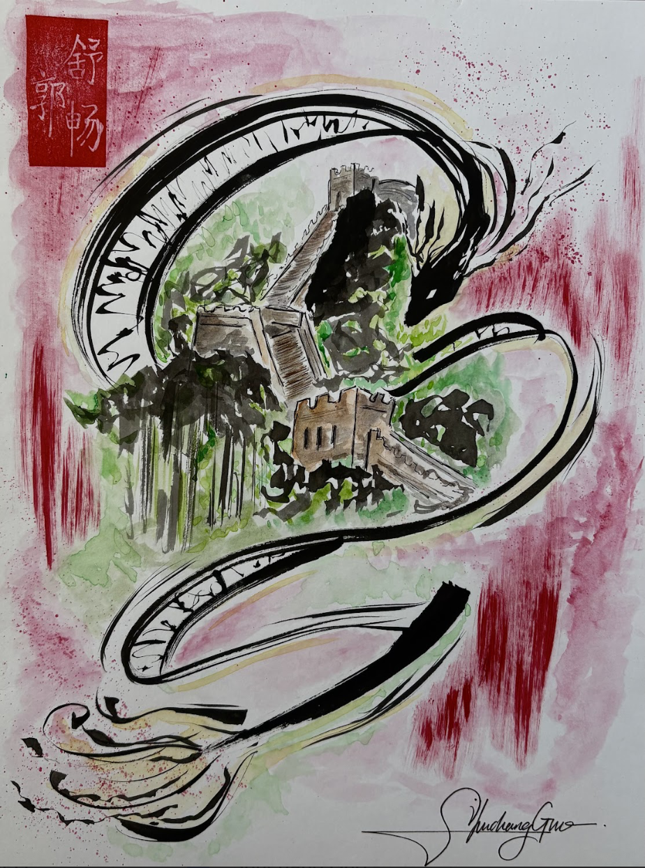 The placement of my artworks is exactly tied to the three categories of Chinese culture I intend to show: Traditional, Mythological, and Contemporary. These categories were placed from left to right in that order, while representing which categories among those three I have experienced or learned about the most. For example, half of my entire exhibition: Chinese ribbon dance, lion dance, the Great Wall, and my mooncake sculptures, collectively display the first category of my three categorized experiences: Traditional, hence it is the category of my culture I spent the most time in my life, both experiencing and learning about. Then, my paintings of the dragon, the dragon and the phoenix paired together, and the collapsing Great Wall collectively represent the second category: Mythological, showcasing my keen interest in Chinese mythology. Lastly, my painting depicting a student imagining the gates of Tsinghua University represents the Contemporary category, showing something significant I learned from my parents regarding education in modern Chinese culture.