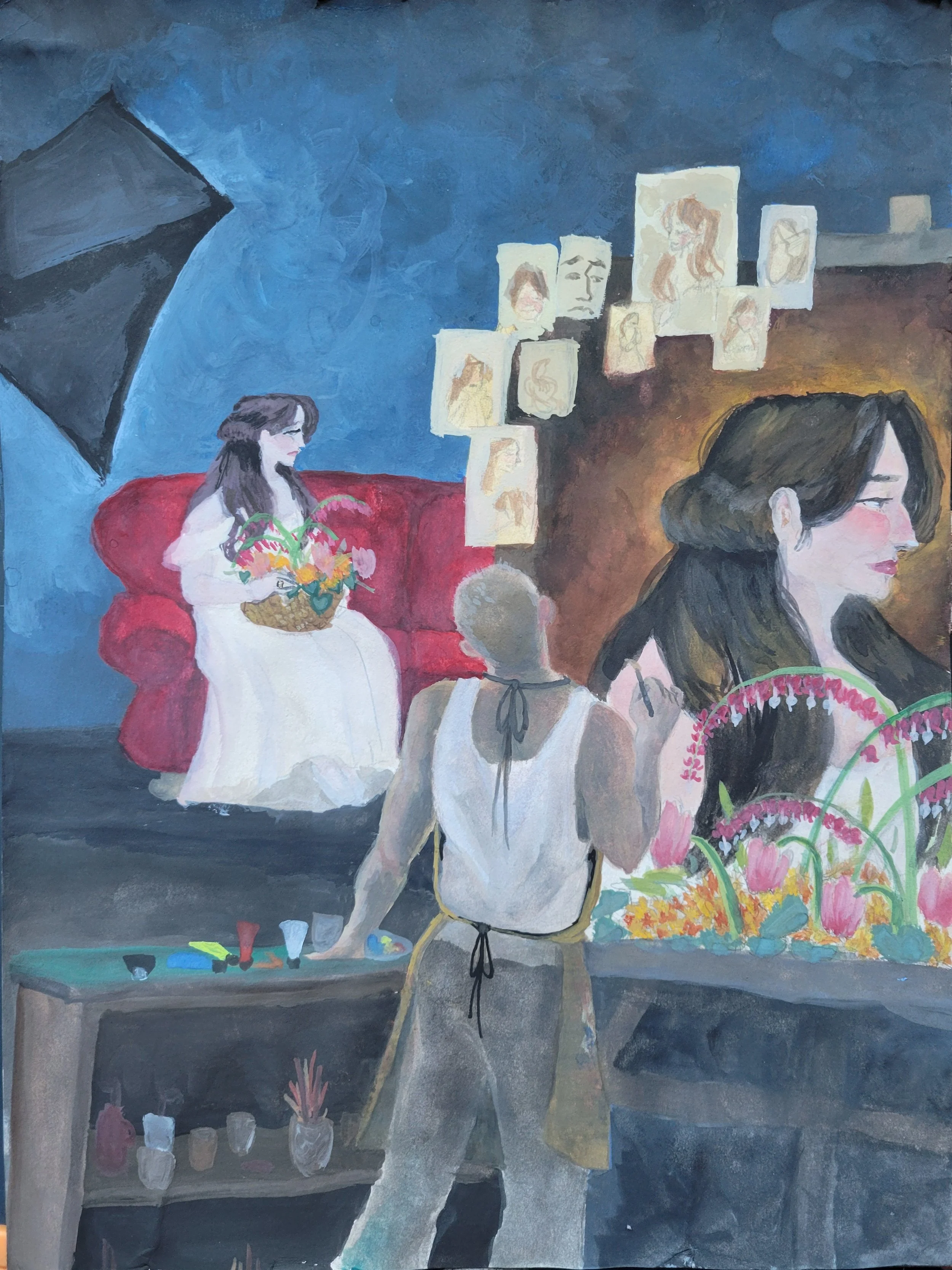 A blend of hard and Soft edge painting. This painting is inspired by the triple portrait by Norman Rockwell. This painting is made to represent one sided love that is delusional. The artist is in love with their muse but the muse is married to another and the artist isn’t accepting that reality and continues to paint her as if she loves him.