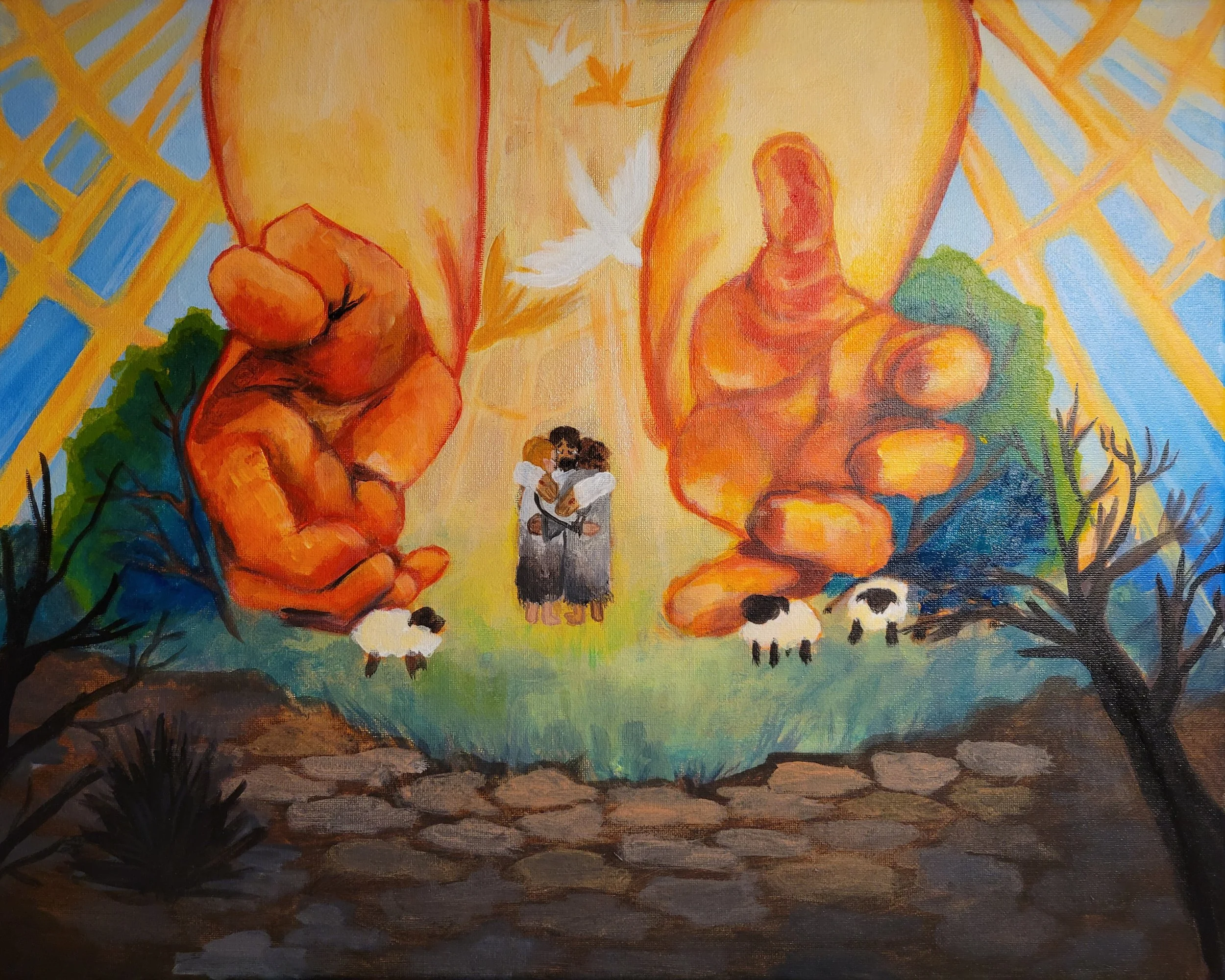 This painting was inspired by The Sun that was done by Edvard Munch in 1909. This painting is meant for the Human Experience: Love from God. The Title is part of the inspiration as the verse is telling of the love that God has for humanity even before we love him, and the results of accepting that love from him. The painting depicts God the Fathers hands, Jesus the Son, and the Holy spirit in the forms of birds reaching to the two humans to accept and love them.