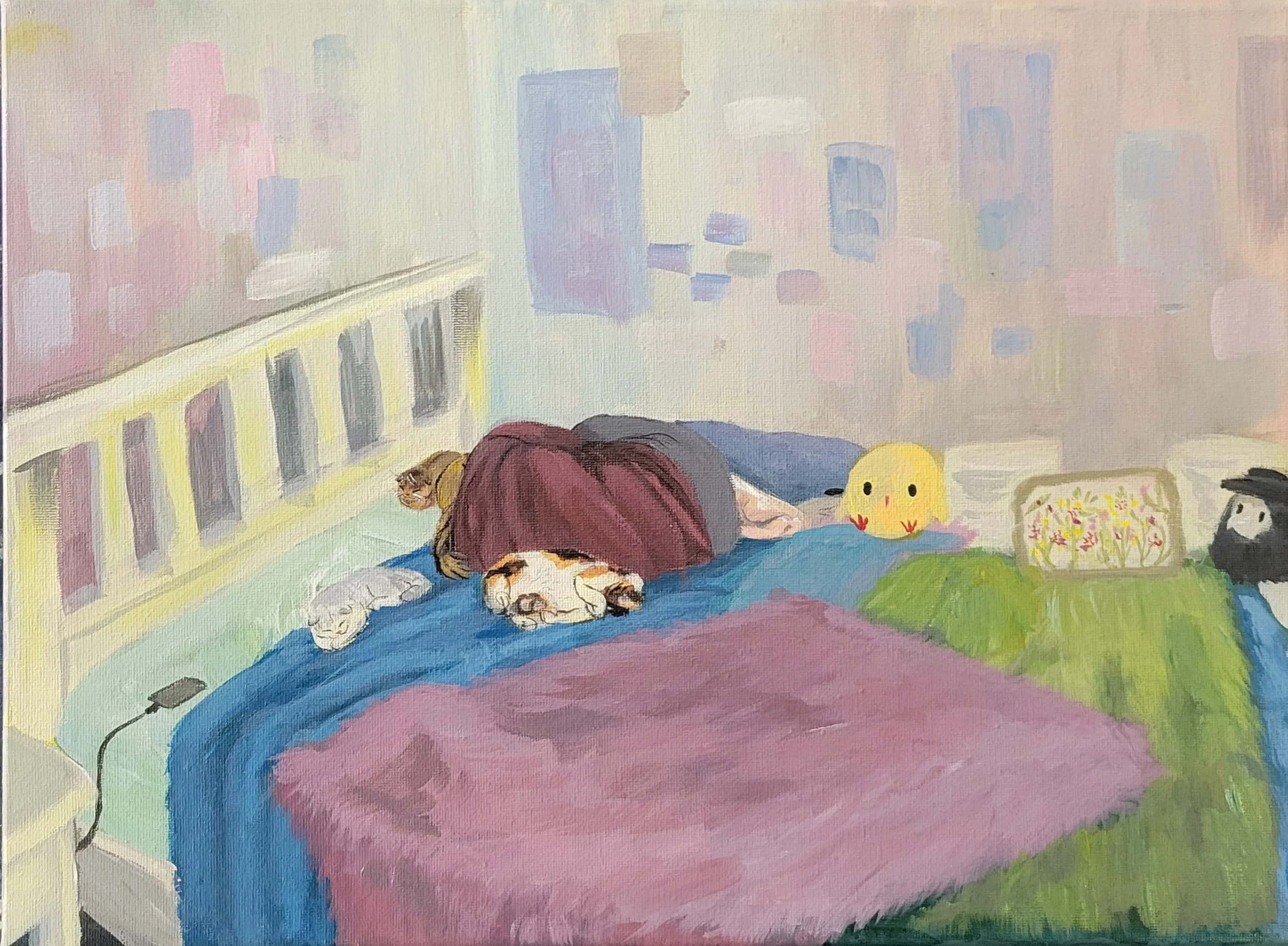 This is a painting meant to express the silent and unwavering love that is felt through owning a pet. It was inspired by Amelia, or @arozear on Instagram. Her use of color and brushwork inspired me. My main goal was to accurately portray my three cats, what service they do for me, and how much they love me even at my lowest. The neutral-toned color palette and the off-balance composition are used to ensure the off feeling of loneliness.