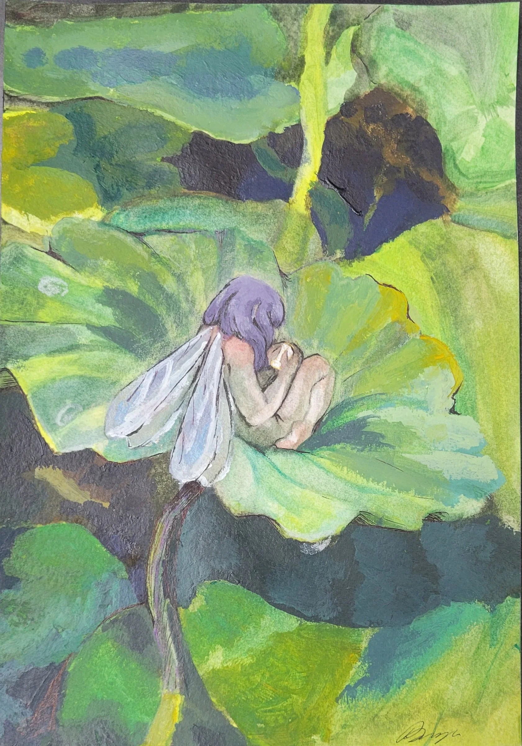 I found inspiration in LA at a Japanese botanical garden. There I felt inspired by the seasonal blooming of lotus flowers and how big the lotus leaves are. The leaves reminded me of comfy hammocks on which a small being could rest upon. An illustration with a small fairy. The style to convey is from children's fairy books. It was going to represent melancholic-nostalgic love. This love can be found in romantic relationships and familia, the act of missing someone is a sign that you loved them.