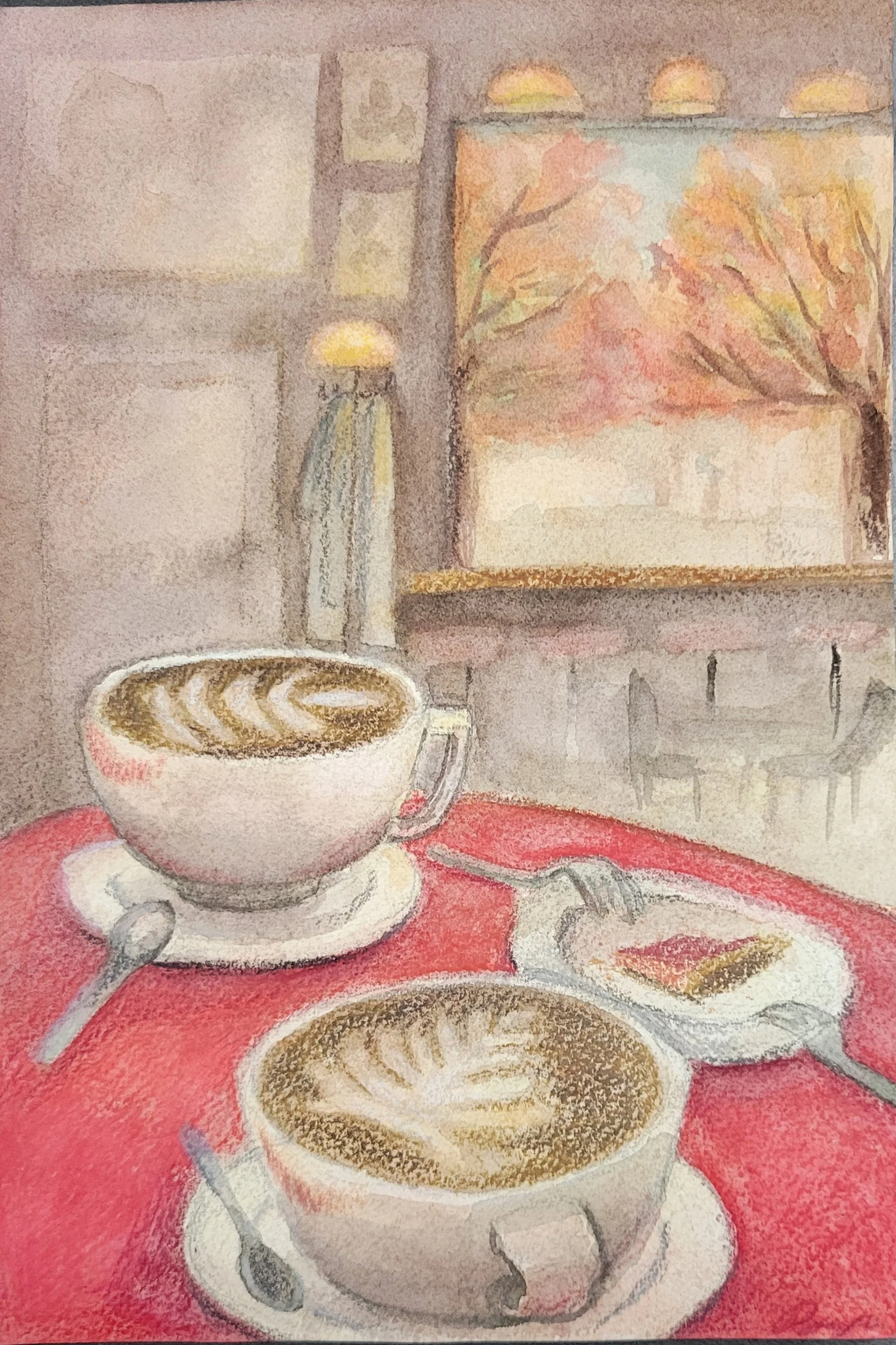 The painting is inspired by the warmth of being at a cafe in fall with a best friend. The use of watercolor helps to give off a dreamy soft atmosphere that is often felt without female friendships. The small details like lipstick stains and a dessert being shared between friends is also important of details. Mainly this painting is done with a soft edge and only hard edge was used to define the details.