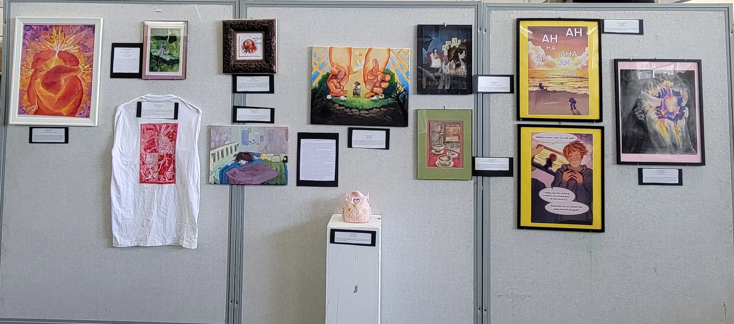 I want the viewer to be able to see the good and see the bad, that’s my works that have a wave of good and bad experiences of love. I have my happiest artworks then paralleled by my saddening ones, so that it’s always there as a reminder that love isn’t always happy. On the other hand I have my saddest works contrasted by my happiest, to commemorate that there is a light of hope and joy in love and that it’s not only sad. I also arranged it in an aesthetic arrangement, where the colors are arranged in a compositional pleasing way, with no over saturation of one color palette on one side. The way that I developed the relationship between the viewer and the artwork by having the experiences be diverse and varied experiences that could have happened to anyone. The main feelings that I want my audience to feel during and after viewing my exhibition is fulfillment. Fulfillment of seeing that love is actually all around us and it isn’t just one type of love but a multitude of ways that we experience it in our life.