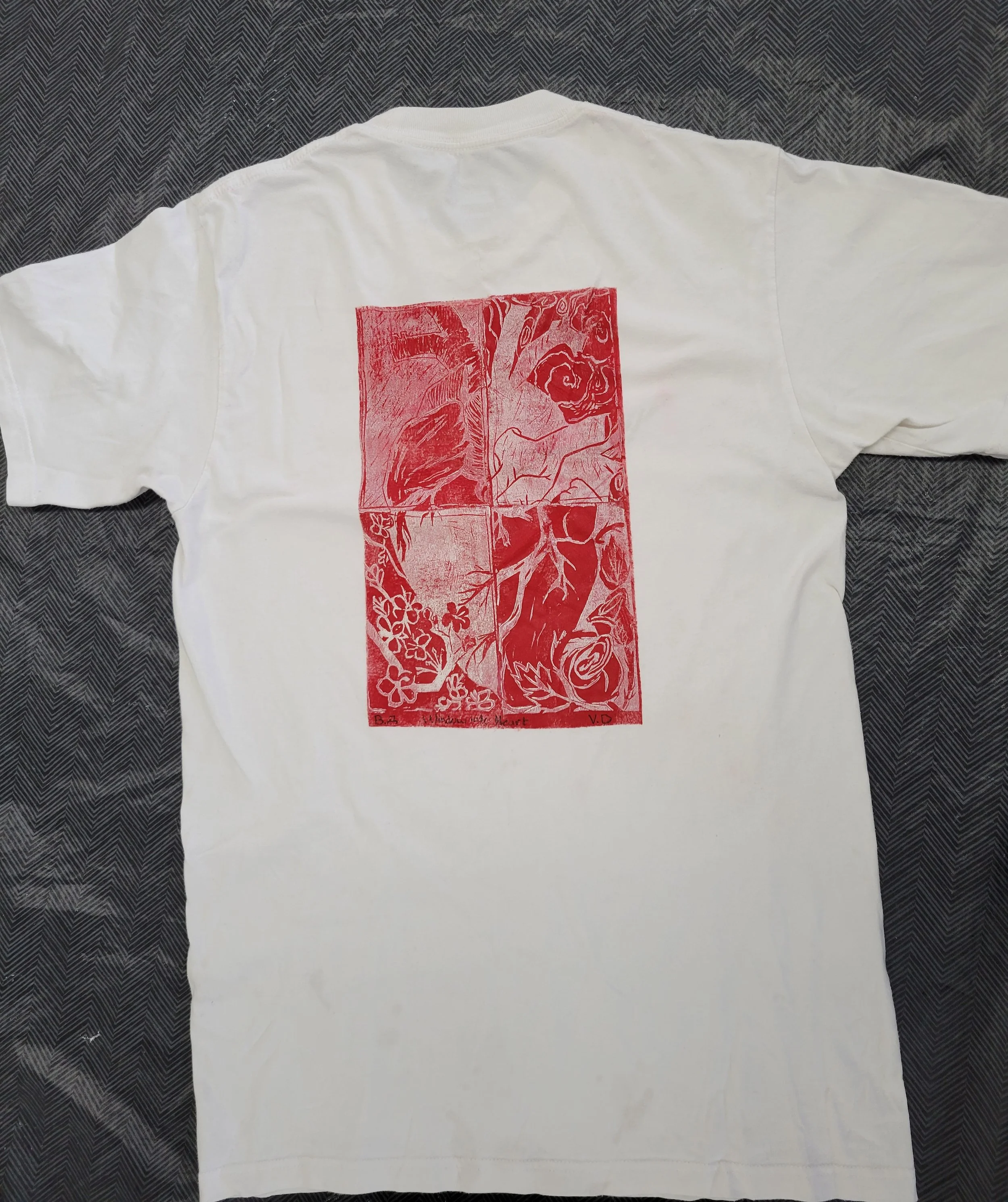 A reference to the idiom expression “wearing your heart on a sleeve”. I was inspired by Neisha Yarger, who goes by burgundy blooms on Instagram. She makes linoleum prints for different clothing articles. I chose to make the anatomical heart to symbolize vulnerable feelings and how see-through they are as if in the glass. Each rectangle is a look into the different aspects of love, the rain is the sadness, the winds is the confusing unpredictable, sakura's is young, roses is experienced love.