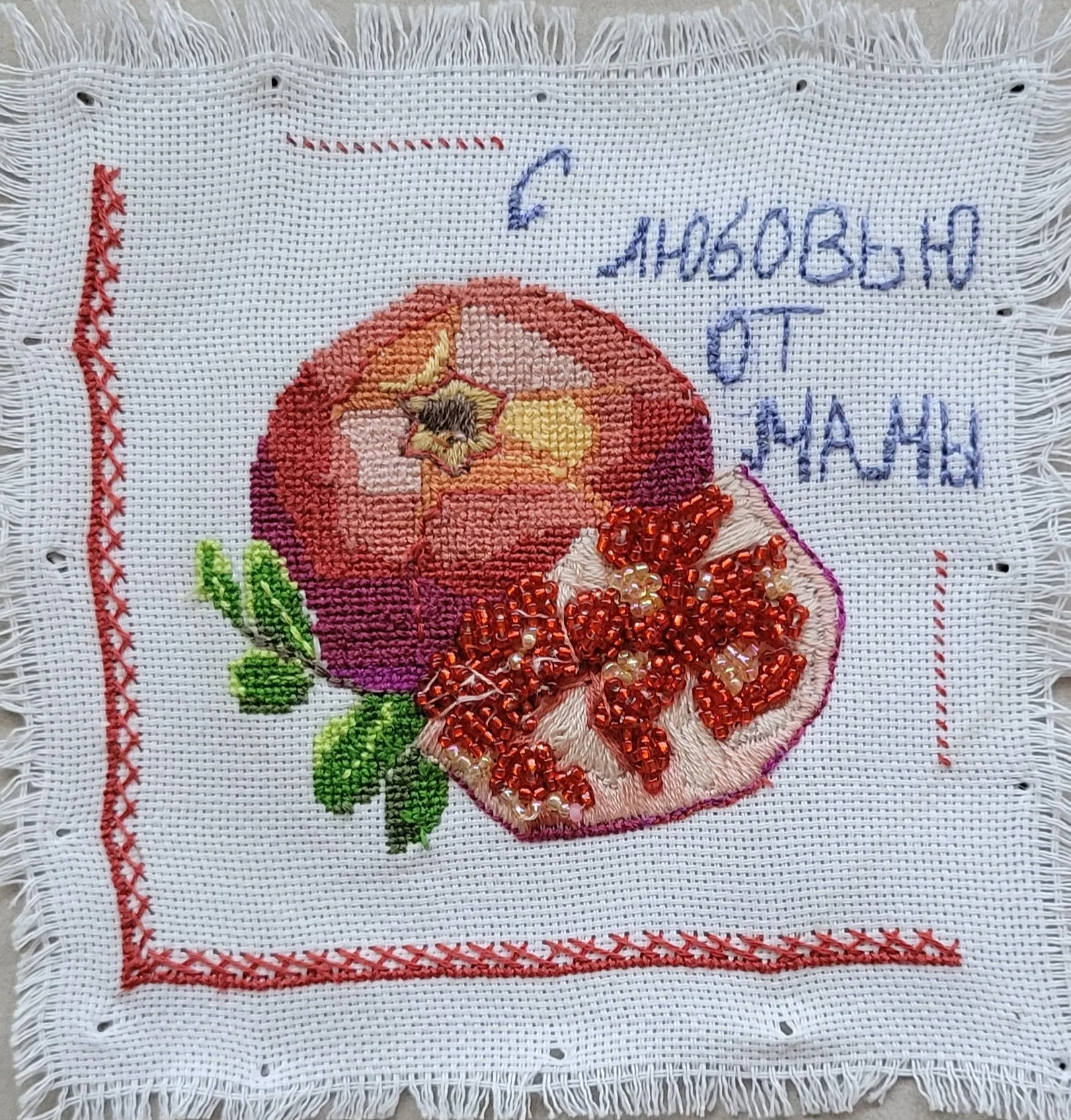 This artwork was inspired by Mary Cassatt and her work that shows motherhood and motherly love. My work is inspired when moms write on lunch napkins or any paper their loved ones will see. The direct translation is " With Love from Mom" in Russian. Where mothers would often use intricate embroidery as a way to express their love to their kids and husbands. The pomegranate is a symbol of life and fertility, which often is a symbol for women, specifically mothers, as they are the givers of life.