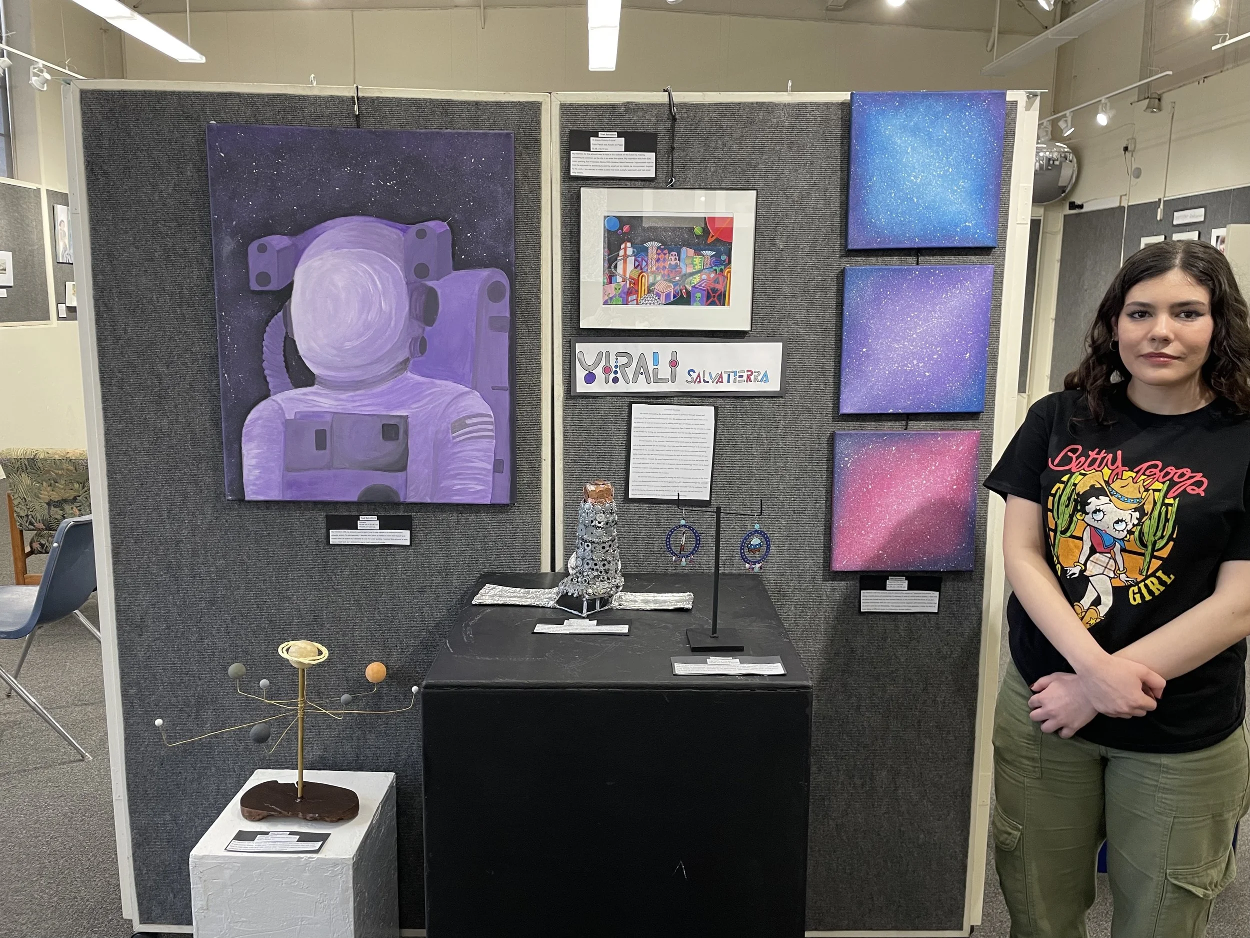 My theme surrounding the involvement of space is portrayed through images and sculptures of the traditional or stereotypical idea the audience may have of space with a twist. My artworks do such an inventive twist by adding some type of vibrancy or mixed media material to my canvas or sculptures to add an imaginative flare. I aimed for my artworks to relate to one another by having my two-dimensional artworks have the star-like background and my three-dimensional artworks relate with our advancement of our knowledge relating to space.